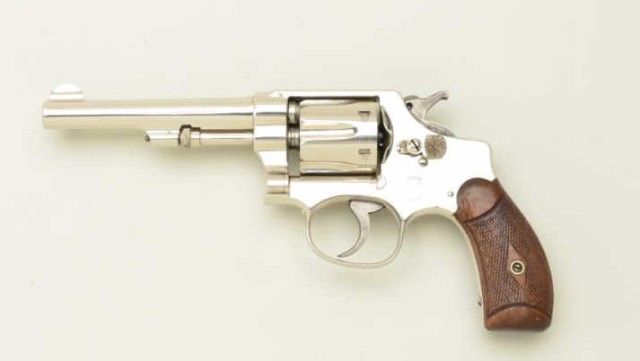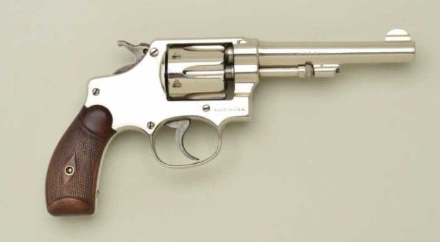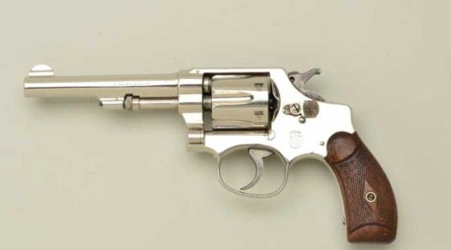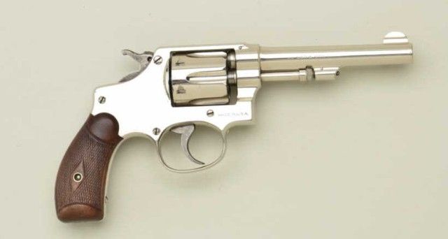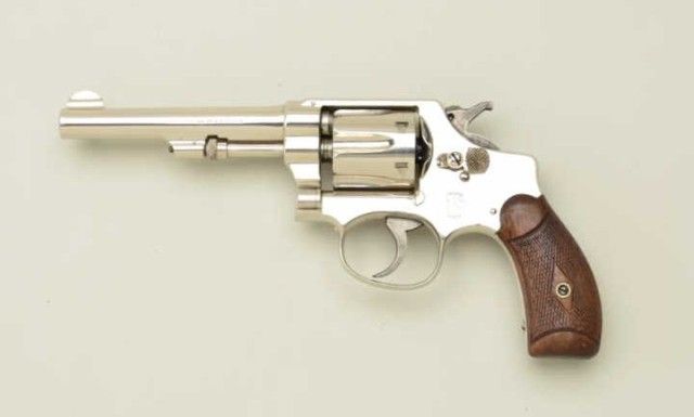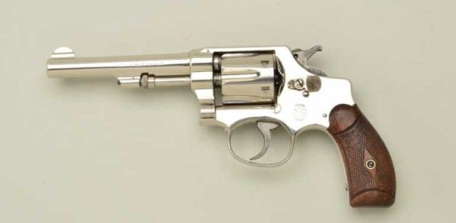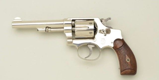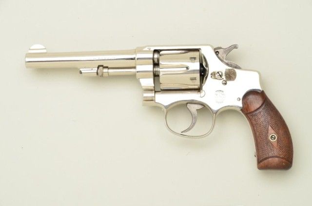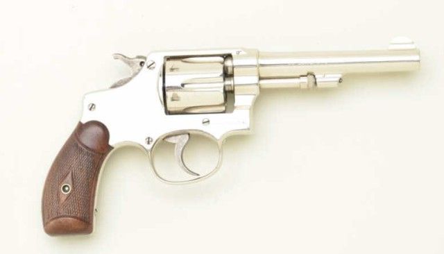 Smith & Wesson I-frame hand ejector Model 1903 DA revolver, .32 Long cal., 4-1/4” barrel, nickel finish, checkered wood grips, rounded butt, #375904. This gun is in overall excellent condition showing approx. 98%original finish, fine bore, action, markings and fine grips with a couple mars at the butt strap. Est.: $300-$600.
