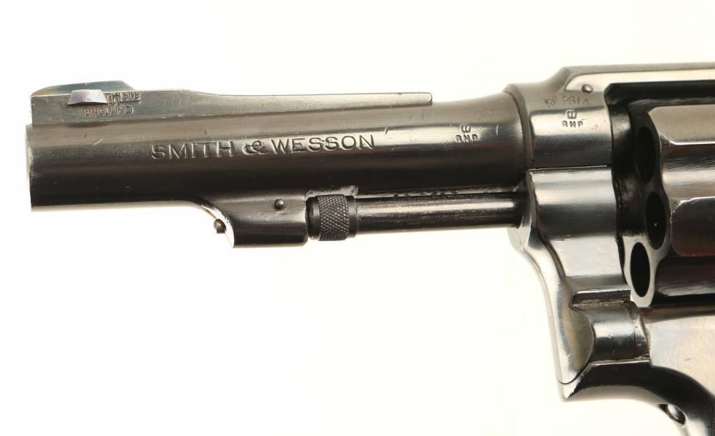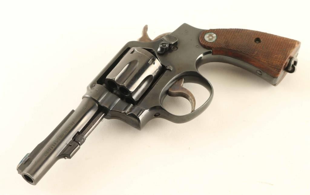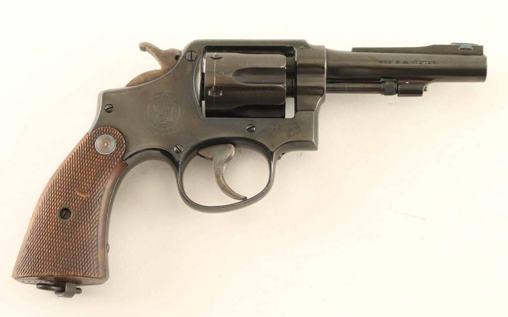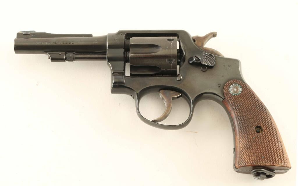 Revolver, Double-action. 6-rd capacity. Blued finish, with case-hardened trigger, and hammer. Checkered wood grips. Pinned barrel, with serrated trigger. 4" barrel with open iron sights. Serial #'s match on barrel, cylinder, and frame. British proofed, including broad arrow. These revolvers were made in the U.S. for lend-lease to England, and Australia. Lanyard ring present. Originally chambered for .38 S&W, this revolver appears to be one that was imported back to the United states, and re-chambered in .38 Spl. ( Simpson Ltd import marked on frame.) They were re-blued from war-time finish, front sight changed, and smooth grips changed. This revolver was likely converted by Parker hale. Bore, and chambers appear excellent. Action is crisp. Finish is about 98%, with wear to the edges, some scratches, and drag lines on the cylinder. NRA Condition-Very Good. Modern Firearm.