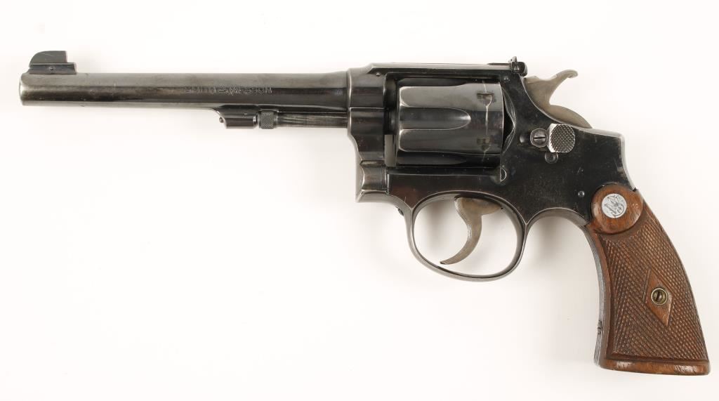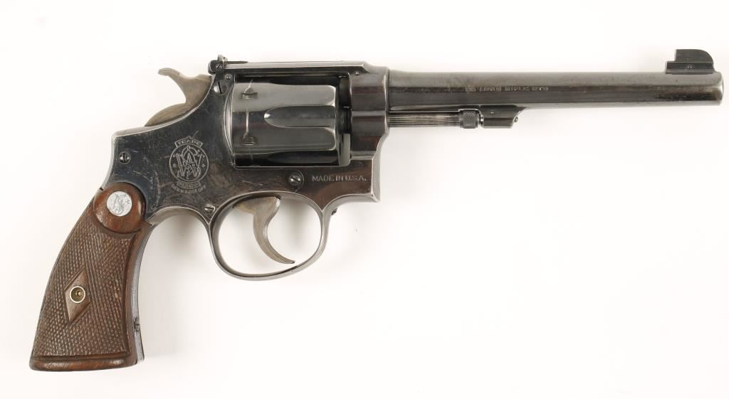 Blued double-action 6-shot revolver with a 6" barrel with target sights. Finish is bright polish with scratches, rubs, edge wear and a heavy drag line. Bore and chambers are bright and the rifling is good. The grips are checkered wood with medallions and they are in worn condition with no chips or cracks. Function is smooth and tight. Condition is good. *Modern Firearm*