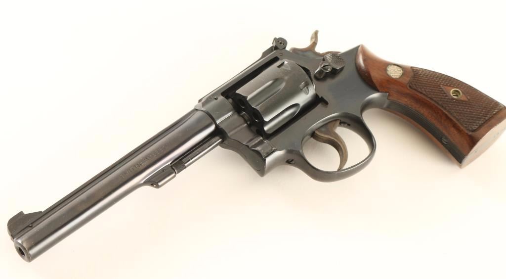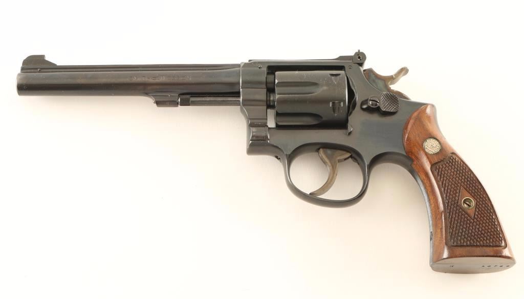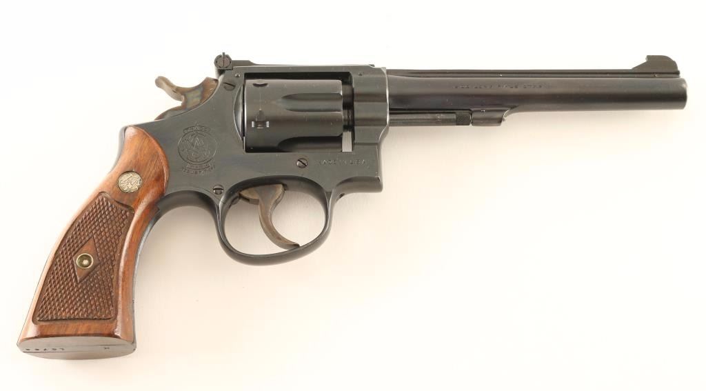 SN: K10766 'Postwar 3rd Model' Vintage medium frame double-action revolver chambered in .22 Long Rifle, circa 1949-1955. Features a blued finish, pinned 6" barrel with narrow top rib, ramped patridge front sight, adjustable micrometer click rear window sight, fluted six-shot cylinder with recessed chambers, non-shrouded ejector rod, .265" serrated trigger, .375" semi-target hammer, square butt K target frame with six groove grip straps, and two-piece diamond checkered walnut Magna grips with silver Smith & Wesson medallions. Revolver exhibits approximately 98% of what appears to be a very high quality refinish showing very little wear. Action is smooth with tight lock-up, bore is is bright with a ring of pitting in the center, and matching wood grips are very good++. Condition is near excellent as restored. ***C&R Firearm*** ***Modern Firearm***