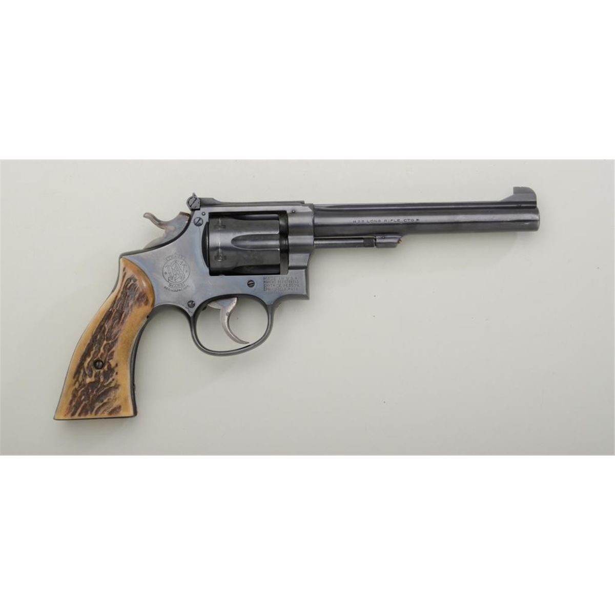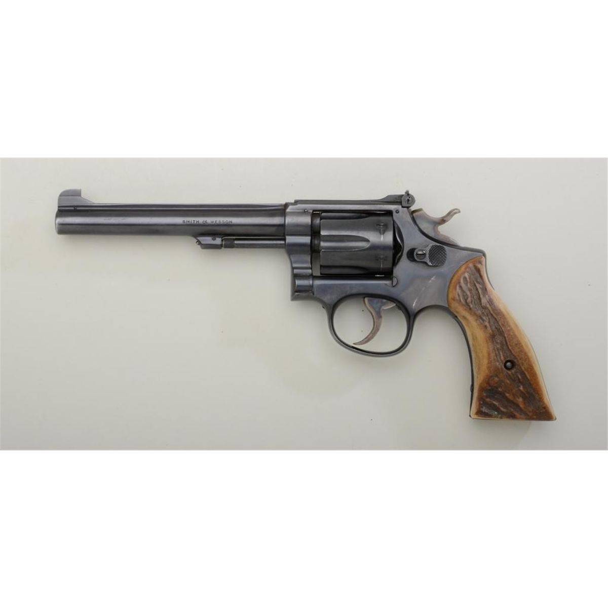 Smith & Wesson (K-22 Model) DA revolver, five screw frame, .22LR cal., 6” barrel, blue finish, thick replacement stag grips, #K190602. This gun is in overall fine + condition showing the majority of itsoriginal finish, fine bore, crisp action, sharp markings, fine older after market grips. Est.: $300-$600.