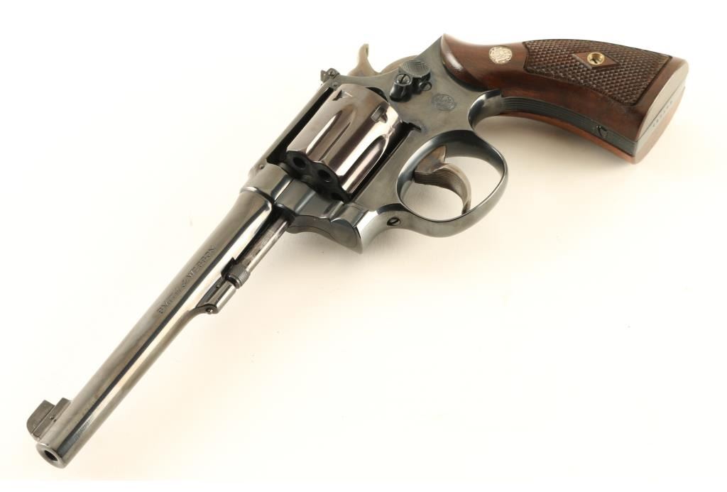 SN: 637869 '1st Model' Professionally refinished pre-war double action revolver chambered in .22 Long Rifle, manufactured circa 1931-1940. 19,500 manufactured. Non-matching grips. Built on a square butt K frame. K target frame with floating firing pin, with flat faced hammer. 6" round pinned barrel. 6-shot fluted cylinder. Patridge front sight. Adjustable rear sight for windage, and elevation. Semi-round topstrap. Non-shrouded extractor rod. Serrated fore strap, and backstrap. Blued metal finish, with case-hardened serrated trigger, and hammer. Checked, diamond, walnut grips, with S&W medallions. (Should have Circassian grips) Action is crisp/tight. Bore, and cylinder chambers are excellent/bright. Grips are excellent. Re-blue is about 98%, with slight scratches, drag lines on the cylinder. There is some wear to the extractor rod. NRA Condition-Excellent as Re-Finished. Modern Firearm. C&R Eligible.