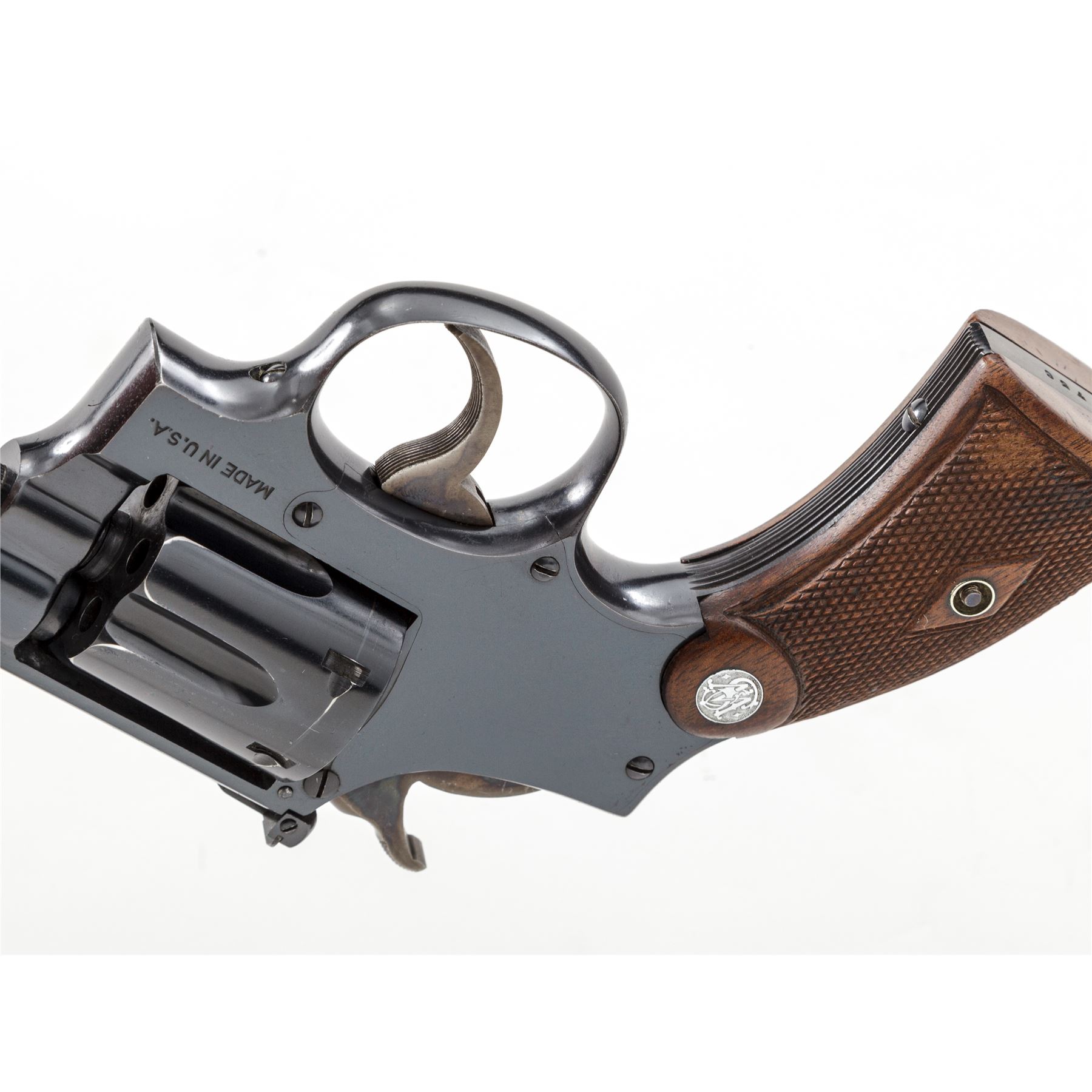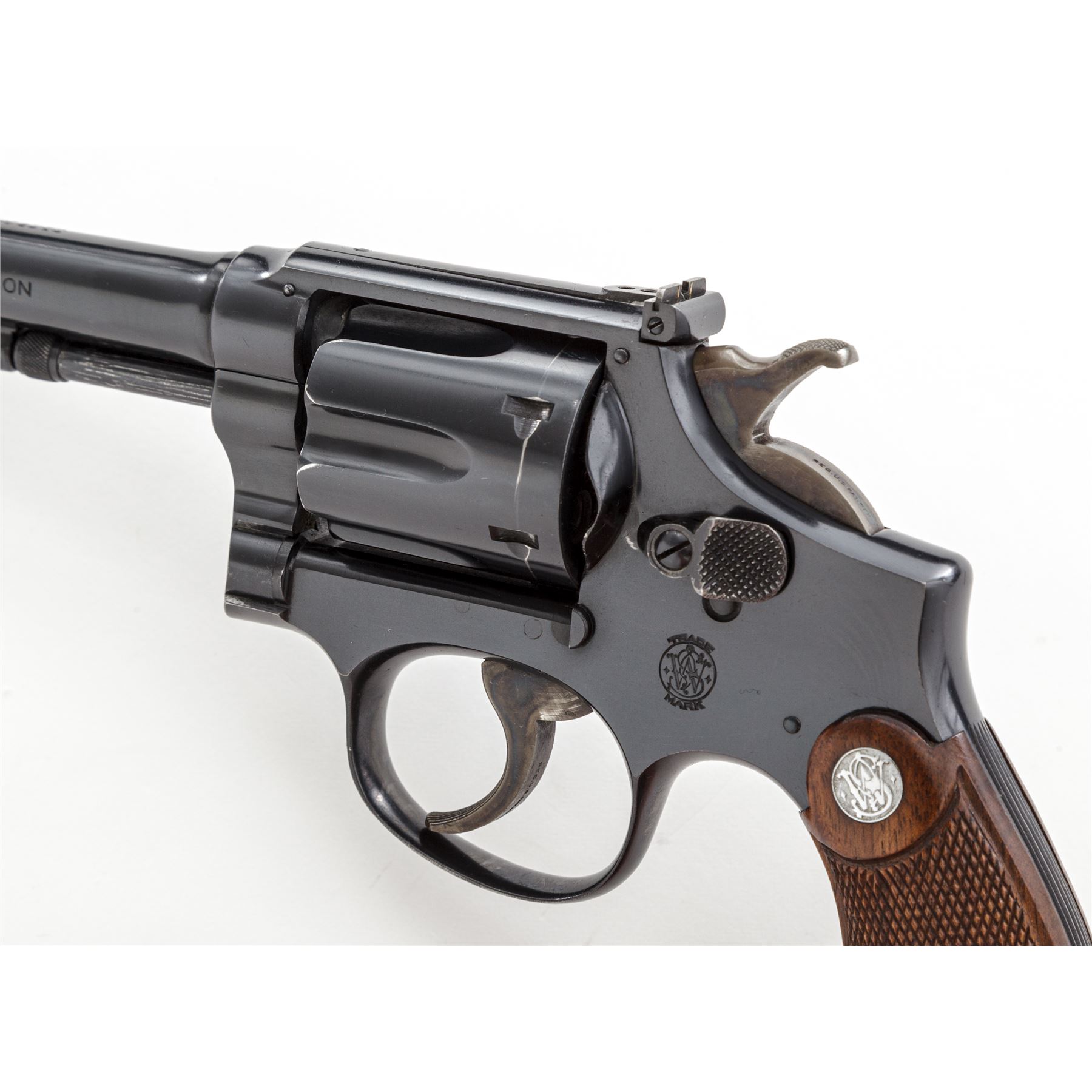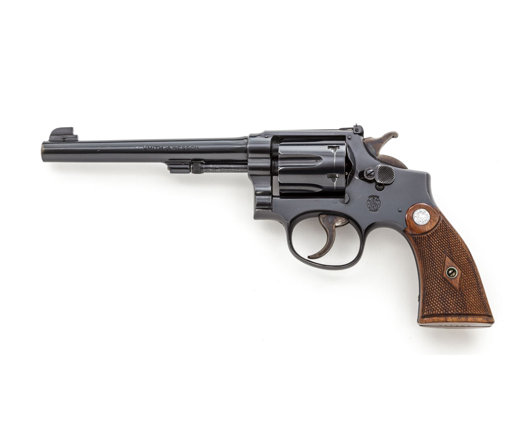 Smith & Wesson K-22 Outdoorsman Double Action Revolver, #649756, .22 LR cal., 6'' pinned barrel, blue finish, matching numbered diamond checkered walnut grips with bright S&W medallions, factory adjustable rear and Patridge front sight. Dating from the mid-1930s. Condition is excellent retaining approx. 96% high-polish blue, with light wear at muzzle, as well as light wear to high points of cylinder flutes, and very light index mark to rear portion of cylinder. Grips and action are excellent, bore is bright. Est.: $1,800-$2,400. (C&R)