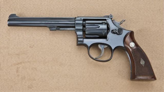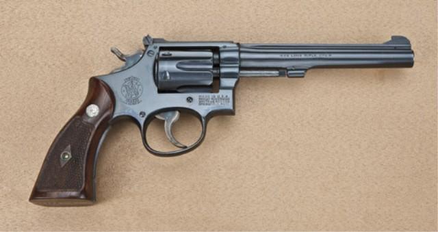 Smith & Wesson K22 target model revolver, blued finish, 6” barrel, checkered wood medallion grips, 4-screw, serial #K63279. The revolver retains approx. 95-98% original blue finish, some slight losses at high points and edges, particularly at the muzzle, slight index line between cylinder stops. The hammer and trigger show 90% case hardening. The grips very good to near fine with slight handling. The action is good, the bore near excellent. A nice example. Est: $400 - $800