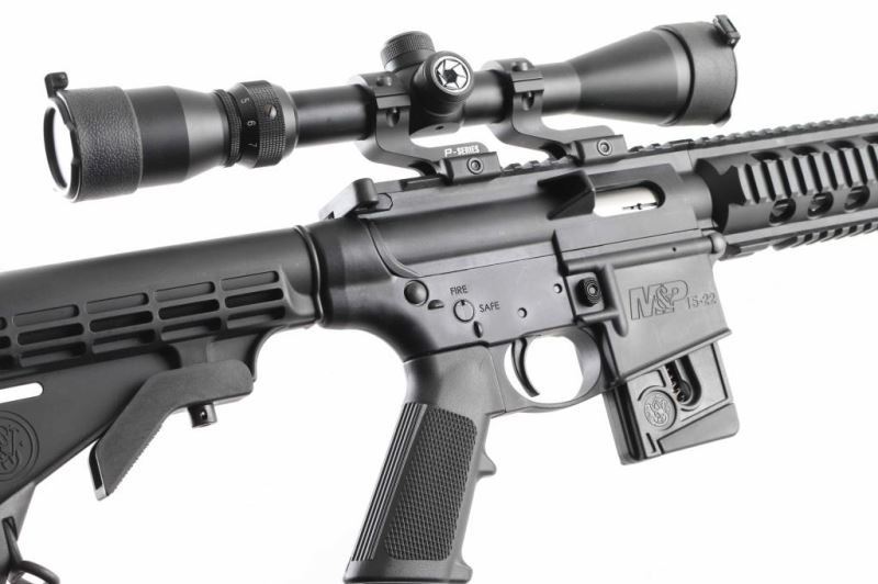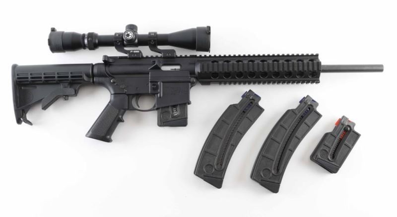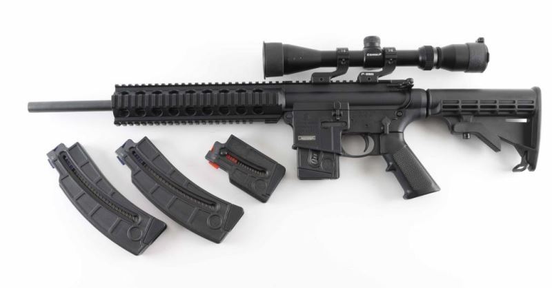 Modern sporting rifle stylized blowback operated semi-automatic rimfire rifle chambered in .22 Long Rifle. Features a high-strength polymer receiver set, non-threaded 16.5” barrel with matte black finish, Barska 3-9x scope mounted with two-piece Nikon P-Series rings, single stage trigger, push button magazine release, factory 10 round magazine, two-position selector lever, polymer quad-rail forend, A2 pistol grip, and six-position collapsible shoulder stock. Includes three additional 10 round factory magazines. Rifle exhibits moderate handling marks with no major wear observed. Action is smooth, the bore is bright, the optics are clear and the synthetic furniture is very good. Condition is NRA Very Good++. ***Modern Firearm***