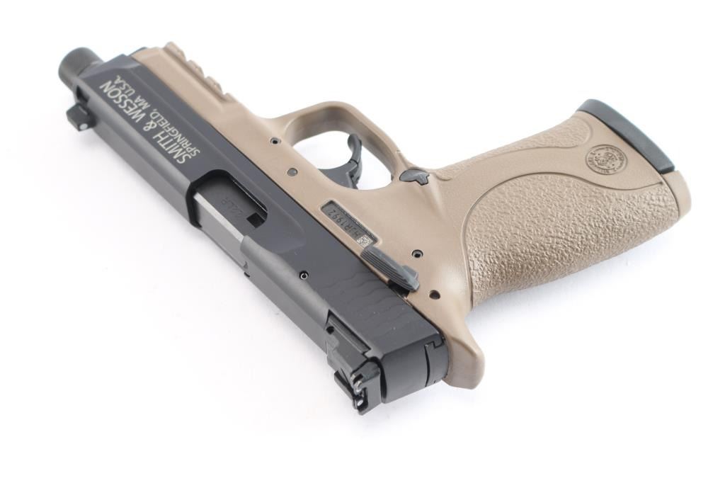 Pistol, Semi-Automatic. Ambidextrous manual safety. Threaded barrel. Picatinny-style rail on frame. Black Armornite slide. carbon steel 3.6" barrel. desert-color Polymer frame/grip. 3 white-dot adjustable sights. Bore is excellent/bright. Finish is excellent. Come in original box, with (2) 10-rd magazines and manual. Safety lock included. Pistol is in almost new condition in box.