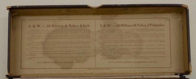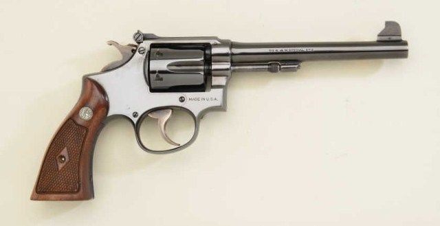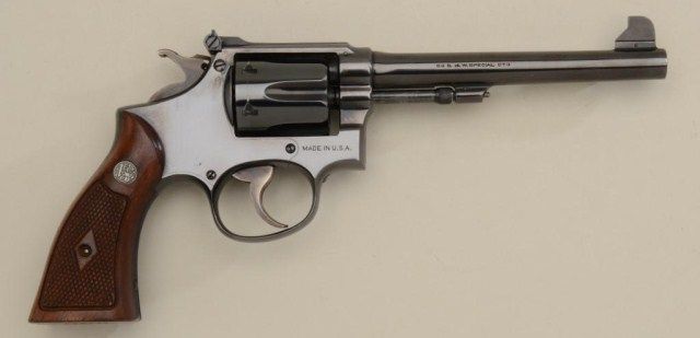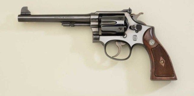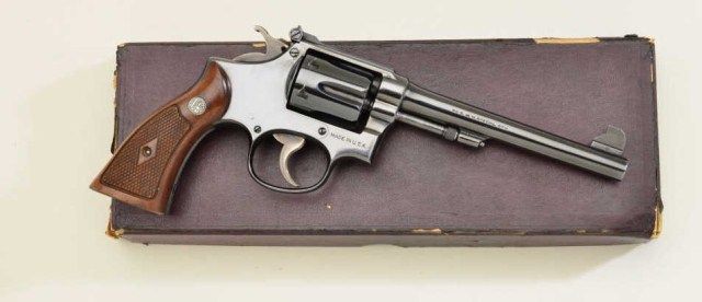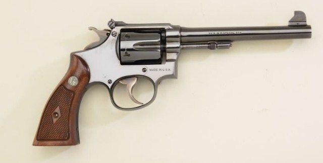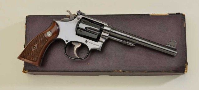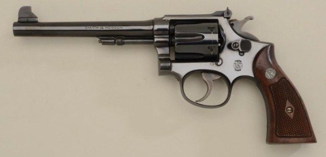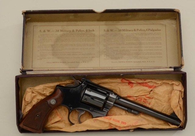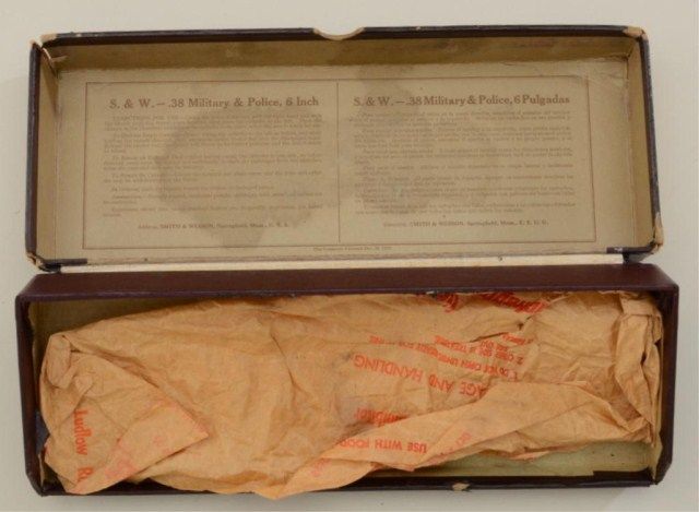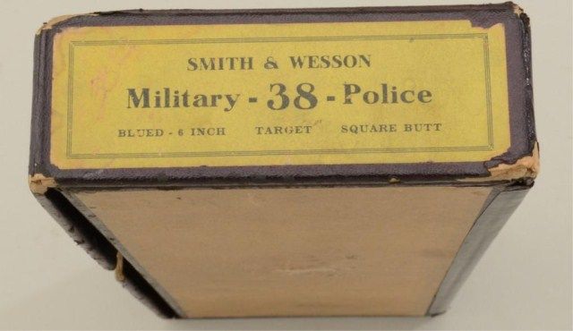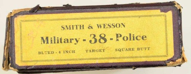 Smith & Wesson M&P Target .38 special double action revolver with 6" bbl. Serial #633646 in fine to excellent original condition showing 96-98% original blue and crisp near excellent original grips. slight index lineon cylinder and limited use. In its original box with correct end label. The box is very good plus but opening at corners. Bore excellent, bright case hardening. A gem of an early target S&W. Est.:$900-$1,800
