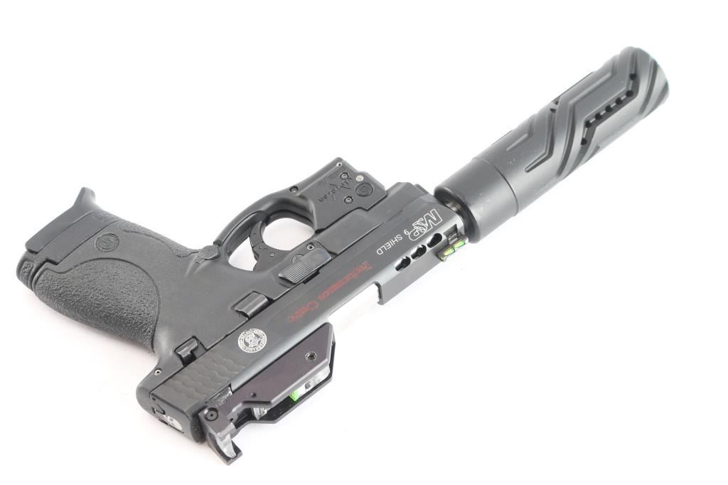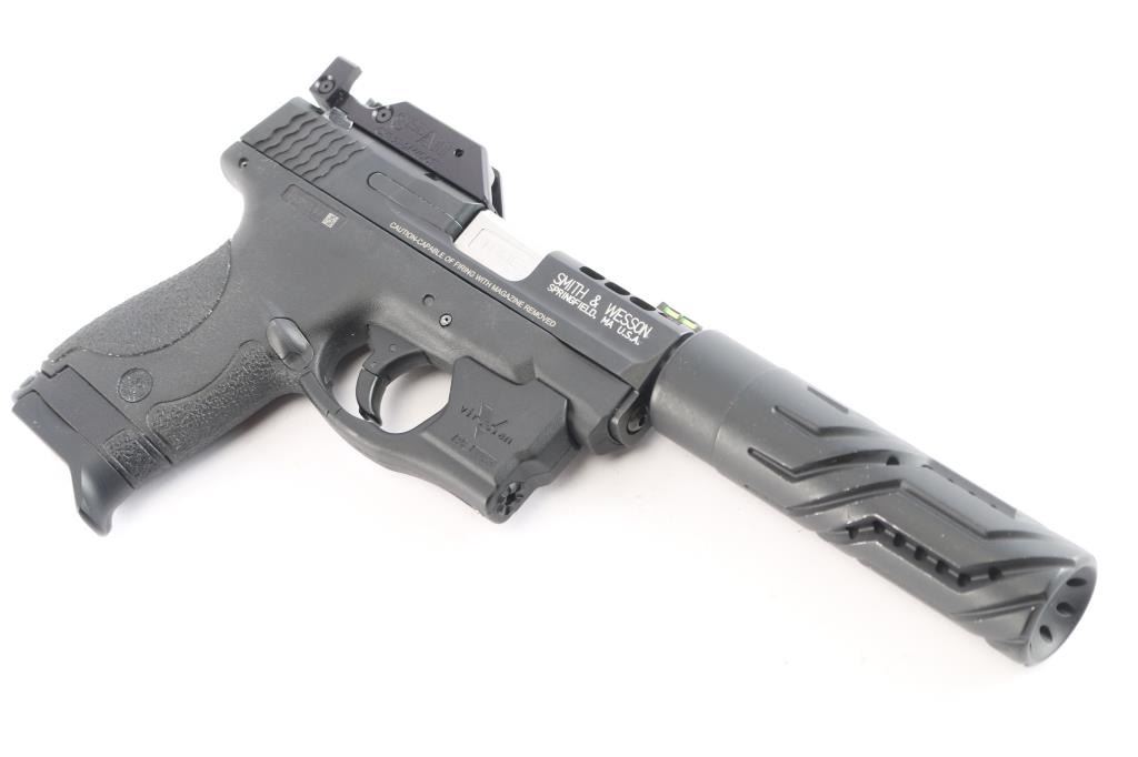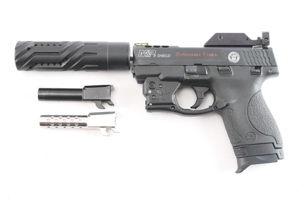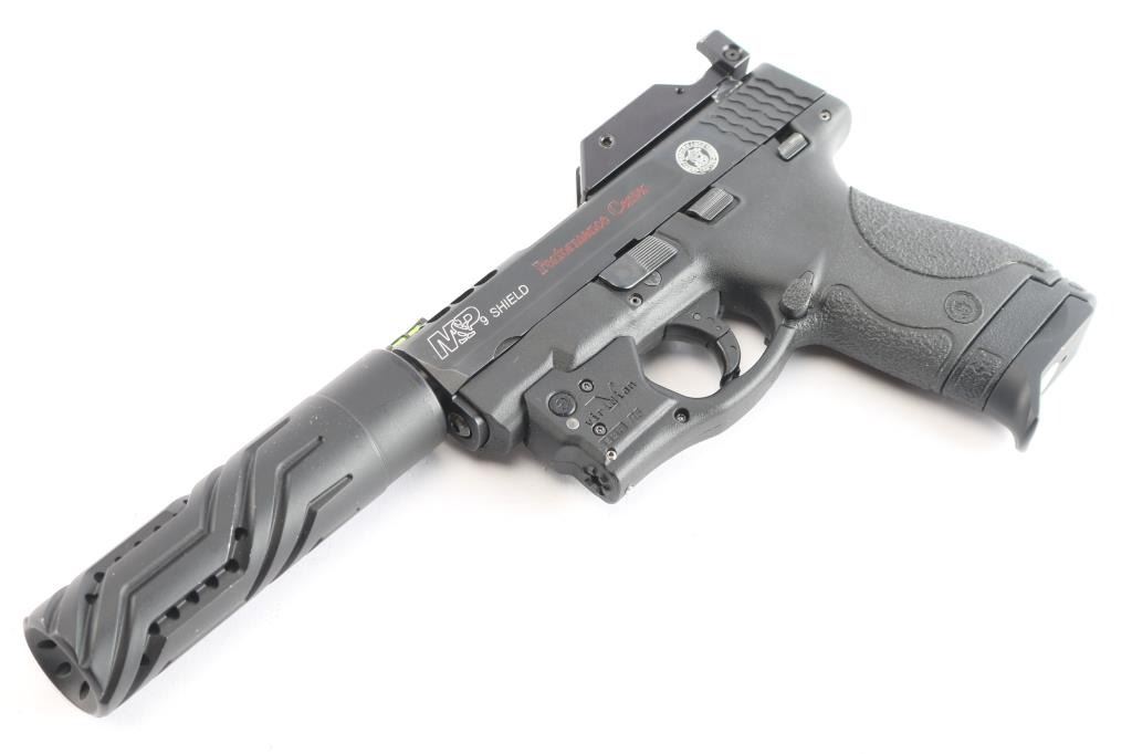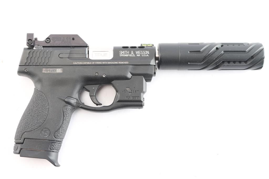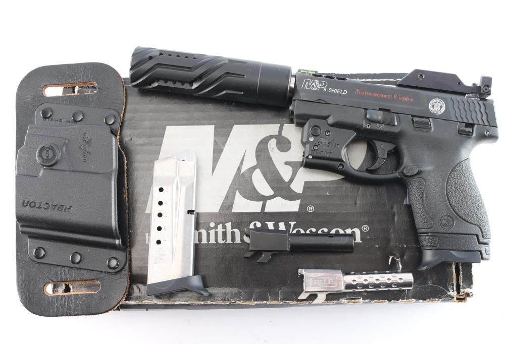 SN: HRP5493. American made striker-fired compact semi-automatic pistol. Features a Performance Center slide kit which consists of a 3.1" ported barrel, six ported Amornite finish slide, topped with green fiber optic front sight and mounted 'See All' magnifying rear sight. Black polymer frame with textured grip, push button magazine release and two part curved trigger/safety and steel guide rod. Bore is very good. Retains approx. 95% finish with some loss under front sight and on safety. Comes with mounted Viridian R5 laser (not tested), Viridian CR1 batts, one 8rd magazine w/finger extension and one 7rd magazine, two True barrels (one threaded), 4.75" faux suppressor, Viridian Reactor holster, manuals, tools and factory cardboard box. Condition is NRA very good. ***Modern Firearm***.