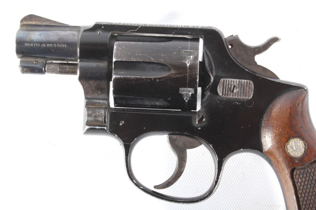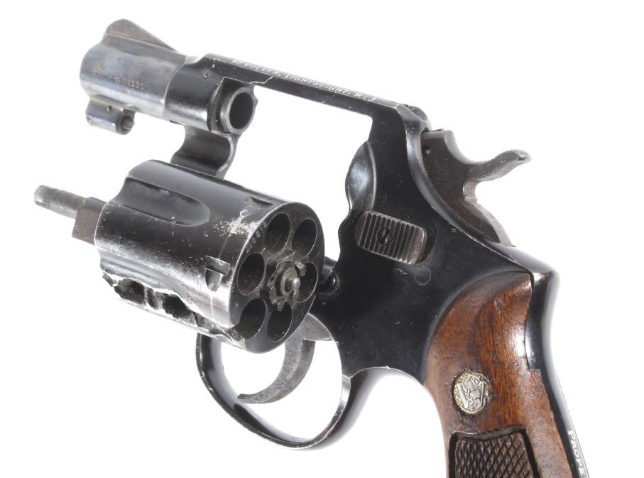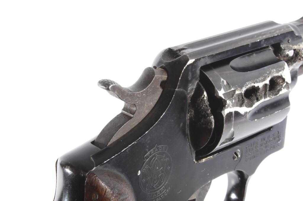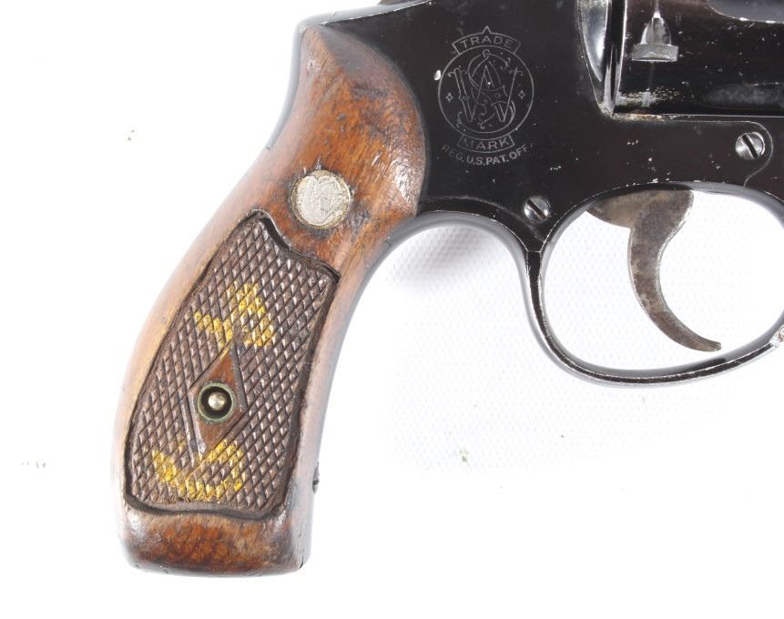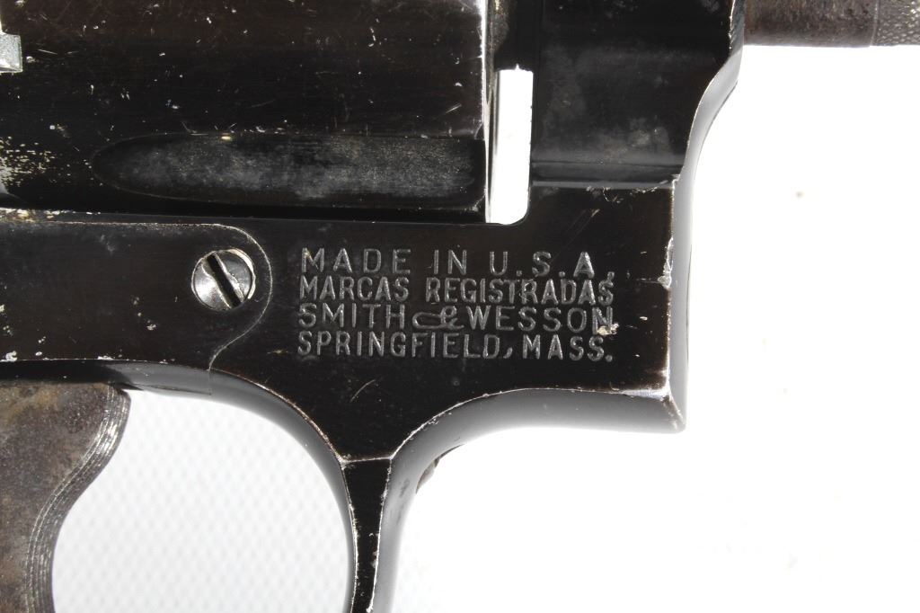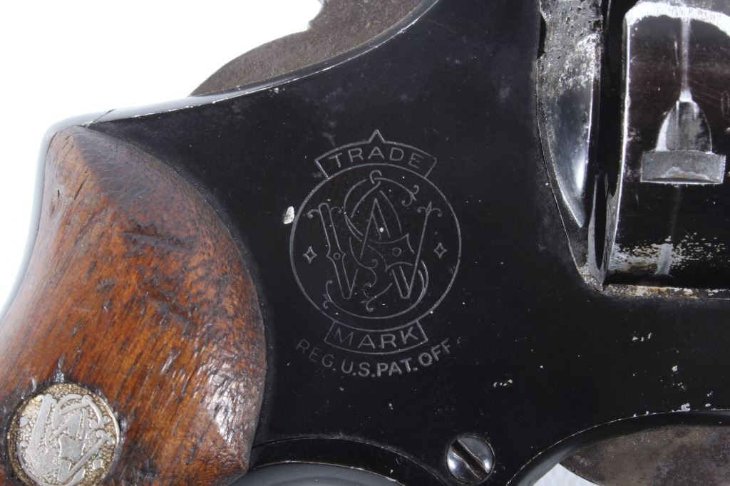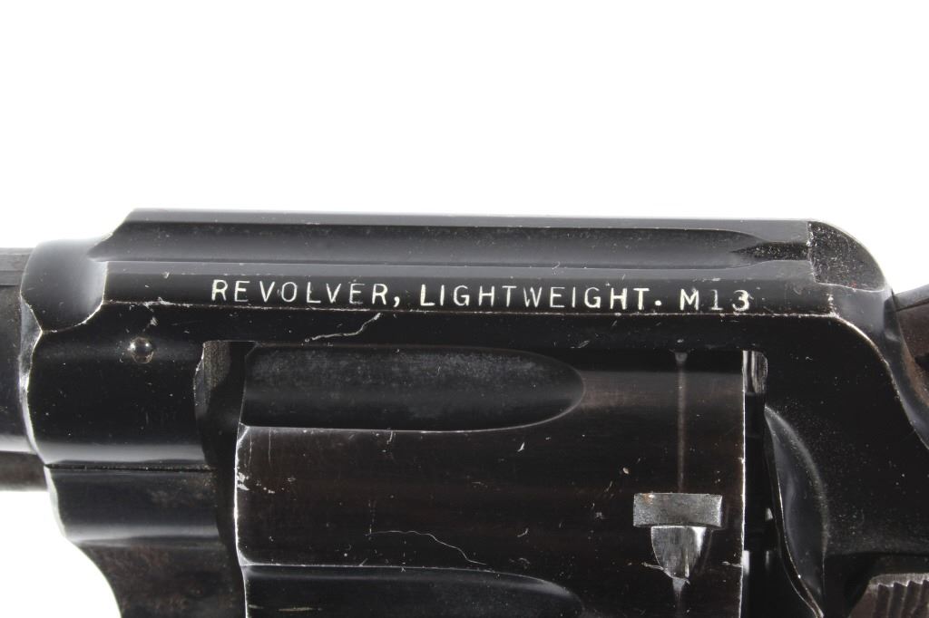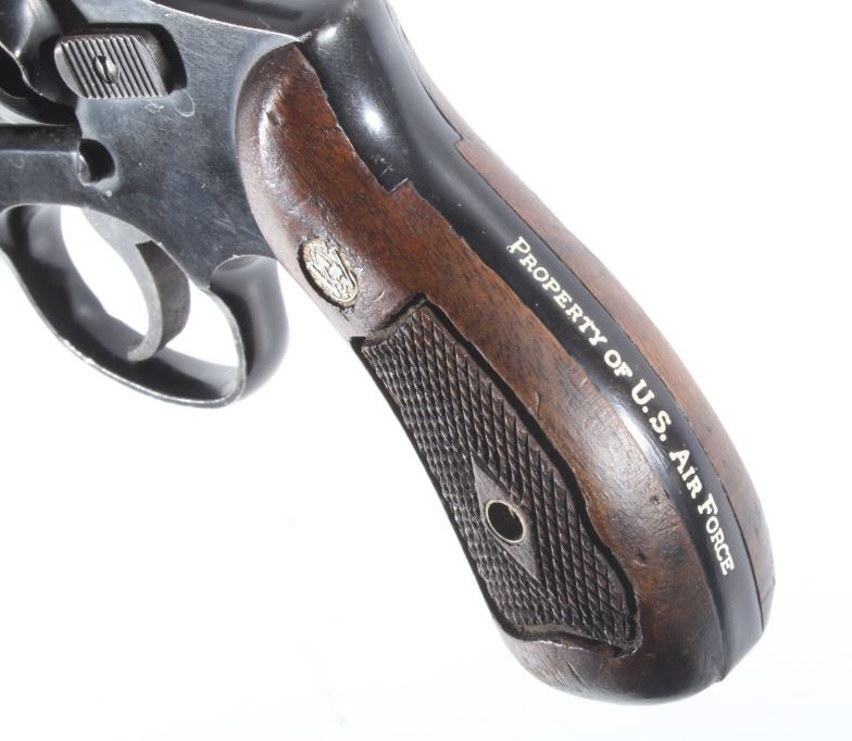 Offered for sale is a RARE Smith & Wesson U.S. Air Force M13 .38 Special Revolver. This extremely rare U.S. Air Force issued handgun was made to be extra lightweight and was factory fitted with an aluminum cylinder. It was intended for mid-range, moderate pressure .38 Special ammo only and was eventually deemed unsafe. Therefore, after being issued, the entire contract was recalled by the government and destroyed by a combination of “torching” or melting and crushing before final discarding. A very few examples escaped this destruction and bring astronomical prices on the collector market today. A few crushed/torched examples also survived- probably taken as souvenirs by those ordered to oversee the elimination of these weapons. Of those that were salvaged, many or most were flattened almost beyond recognition and are usually missing cylinders or other major parts. This fine example of a semi-torched Aircrewman has all matching serial numbers (#C298512) on the frame, cylinder, barrel and inside the original diamond checkered grips. The back strap correctly marked “PROPERTY OF U.S. AIR FORCE.”The top strap on the left side also correctly marked “REVOLVER, LIGHTWEIGHT, M-13.” The frame retains the S&W logo as well as the usual patent dates and the barrel retains the Smith & Wesson marking. The bottom of the grips stamped “49” and there is a matching “49” in light paint on the right grip panel- this was probably an issue or rack number. This is a 4-screw model with correct flat latch that was made in 1954 and aside from the single line of torching, retains almost all of the original deep blue finish. The right side of the barrel and forward part of the frame “torched” as is one side of the cylinder over one chamber. Amazingly, this revolver still functions perfectly. It is very possible it was torched just enough to get past inspection and was then “rescued” from final disposal. An extremely important martial arm that is almost always missing from even the most complete collections, this is a chance to own an example that was issued and used by our fighter pilots in the Cold War years of the 1950s and finally recalled and destroyed by our government.