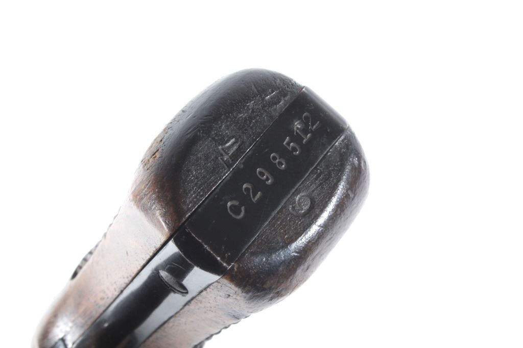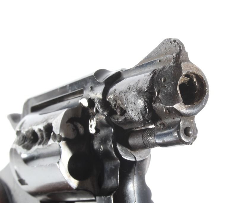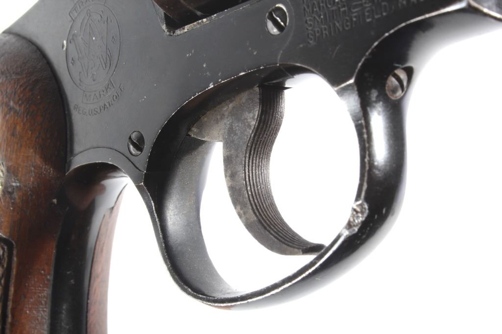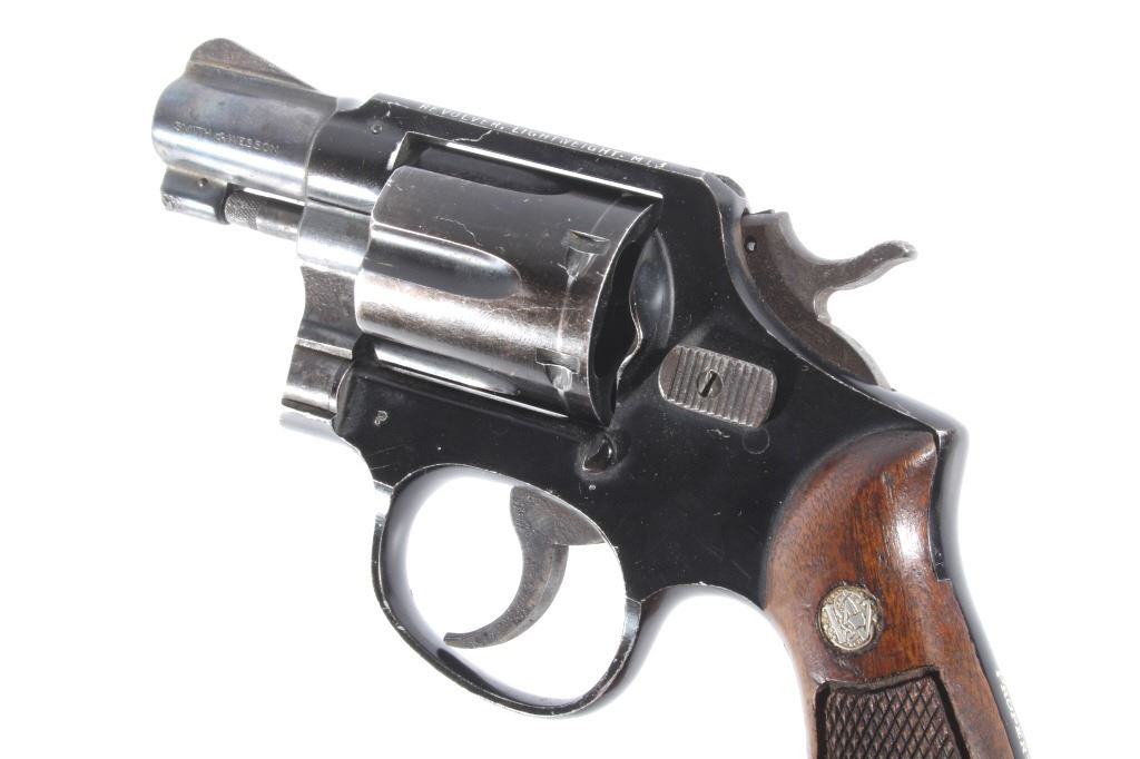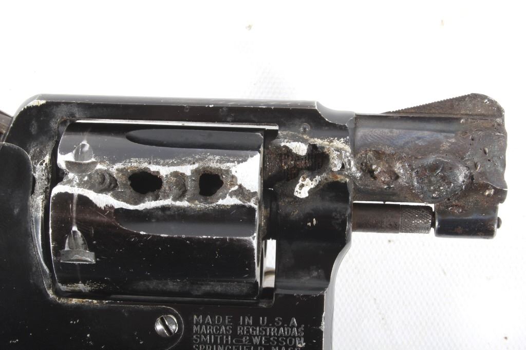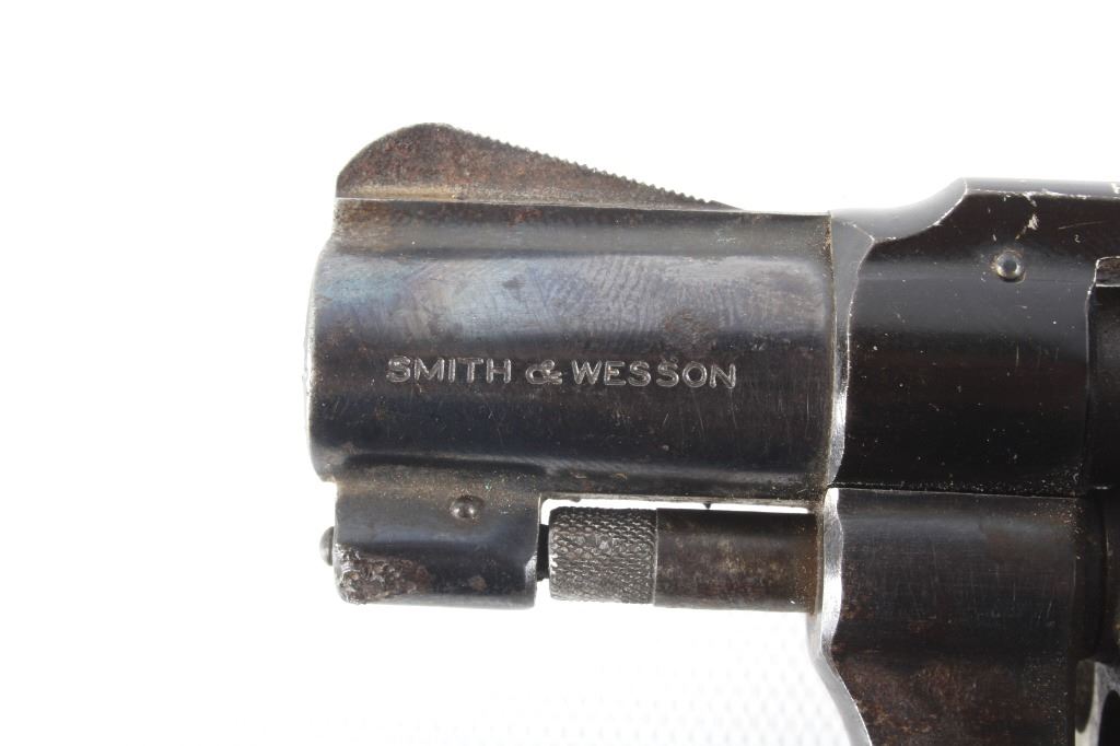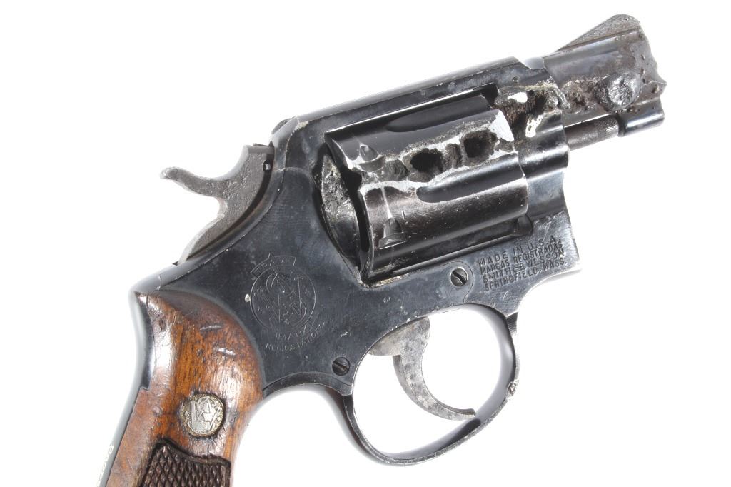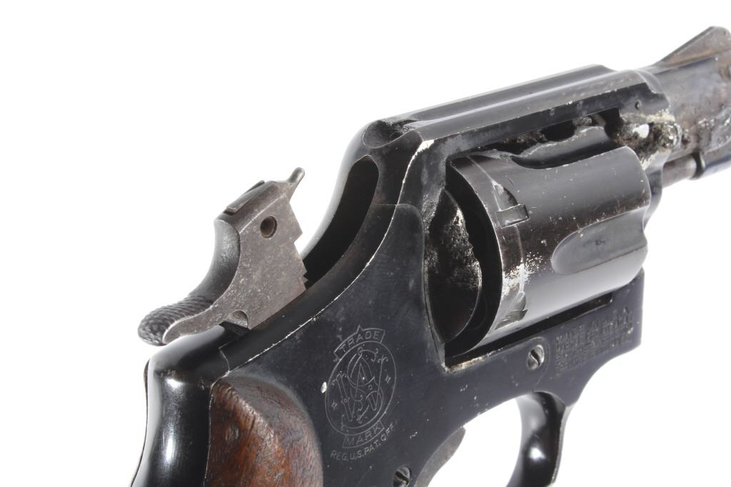 Offered for sale is a RARE Smith & Wesson U.S. Air Force M13 .38 Special Revolver. This extremely rare U.S. Air Force issued handgun was made to be extra lightweight and was factory fitted with an aluminum cylinder. It was intended for mid-range, moderate pressure .38 Special ammo only and was eventually deemed unsafe. Therefore, after being issued, the entire contract was recalled by the government and destroyed by a combination of “torching” or melting and crushing before final discarding. A very few examples escaped this destruction and bring astronomical prices on the collector market today. A few crushed/torched examples also survived- probably taken as souvenirs by those ordered to oversee the elimination of these weapons. Of those that were salvaged, many or most were flattened almost beyond recognition and are usually missing cylinders or other major parts. This fine example of a semi-torched Aircrewman has all matching serial numbers (#C298512) on the frame, cylinder, barrel and inside the original diamond checkered grips. The back strap correctly marked “PROPERTY OF U.S. AIR FORCE.”The top strap on the left side also correctly marked “REVOLVER, LIGHTWEIGHT, M-13.” The frame retains the S&W logo as well as the usual patent dates and the barrel retains the Smith & Wesson marking. The bottom of the grips stamped “49” and there is a matching “49” in light paint on the right grip panel- this was probably an issue or rack number. This is a 4-screw model with correct flat latch that was made in 1954 and aside from the single line of torching, retains almost all of the original deep blue finish. The right side of the barrel and forward part of the frame “torched” as is one side of the cylinder over one chamber. Amazingly, this revolver still functions perfectly. It is very possible it was torched just enough to get past inspection and was then “rescued” from final disposal. An extremely important martial arm that is almost always missing from even the most complete collections, this is a chance to own an example that was issued and used by our fighter pilots in the Cold War years of the 1950s and finally recalled and destroyed by our government.