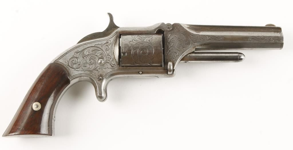 Single action spur trigger 1st issue tip up 5 shot revolver with 3-1/2" octagon solid rib barrel. nickel finish, scroll engraved receiver, cylinder and sides of barrel, square butt rosewood grips numbered to gun, and fixed sights. Good markings and very good working action. Condition: Very good showing small pocket of light pitting near hinge and grips are very good with no loss. *Antique Firearm*