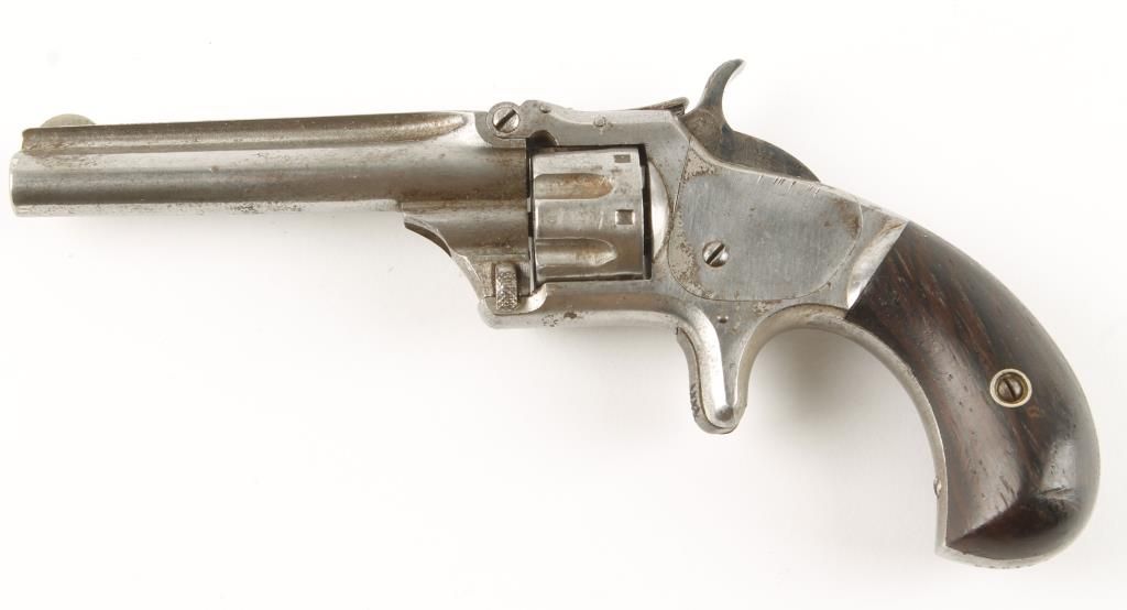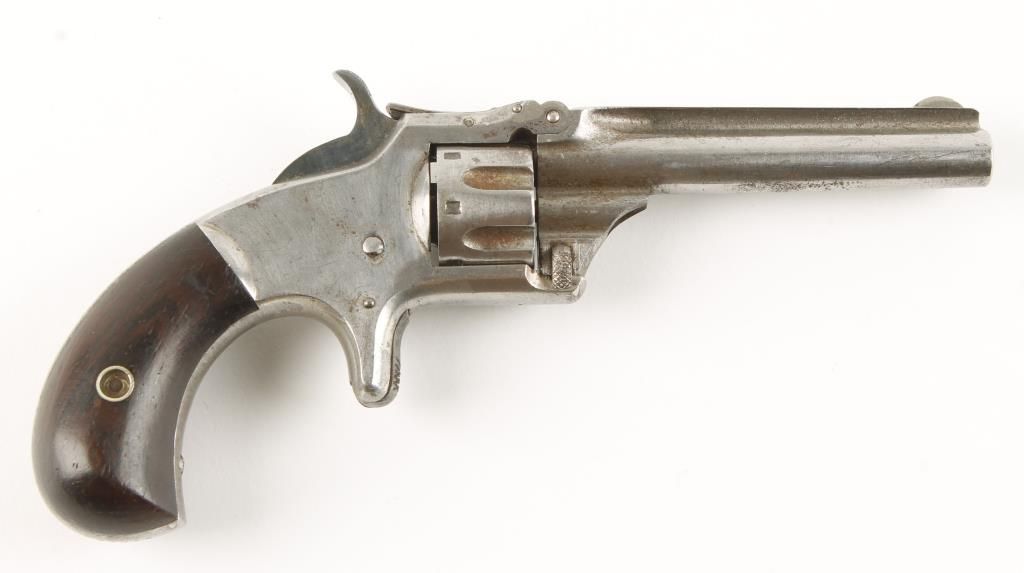 Single action spur trigger 3rd issue tip up 7 shot revolver made in early 1880's with 3-1/4" round solid rib barrel. Nickel finish, rosewood birdshead grips, fluted cylinder and fixed sights. Good markings and good working action. Condition: Very good showing 60% original finish and grips are very good showing no loss. *Antique Firearm*