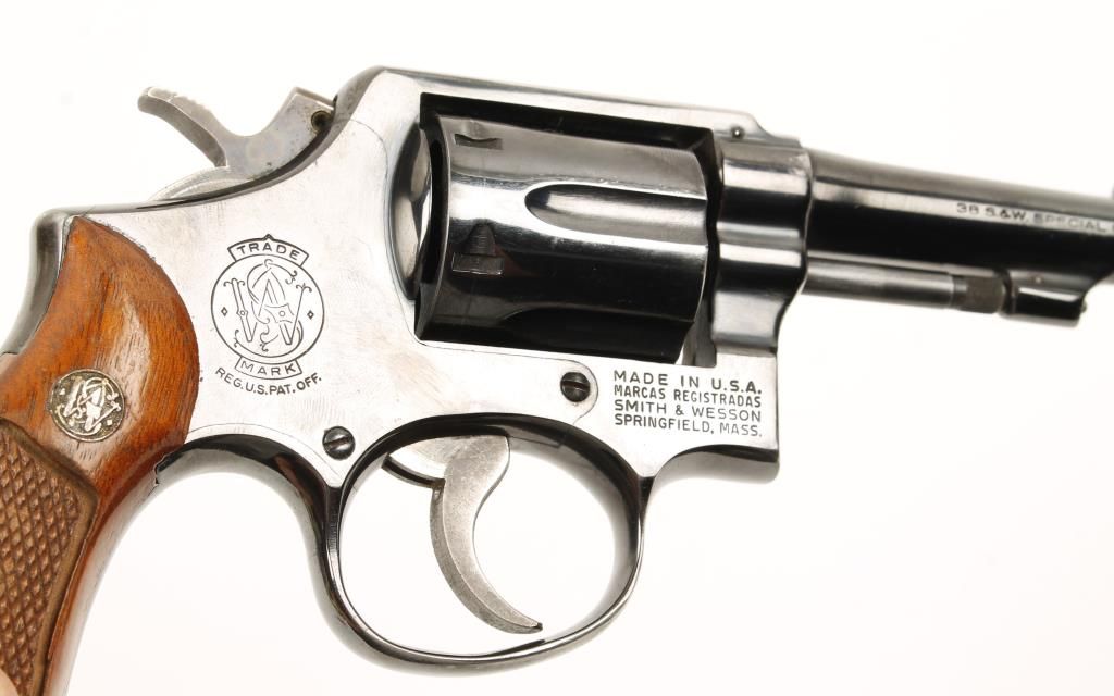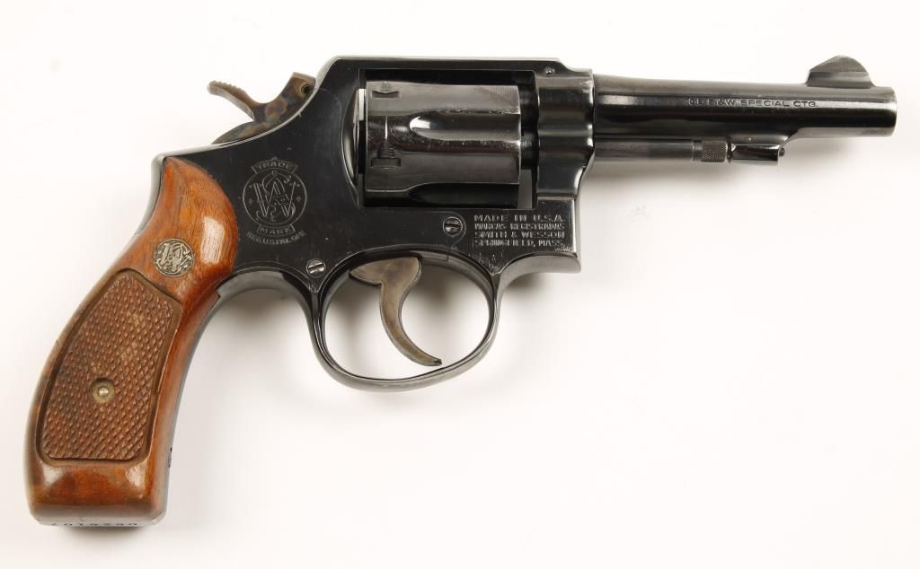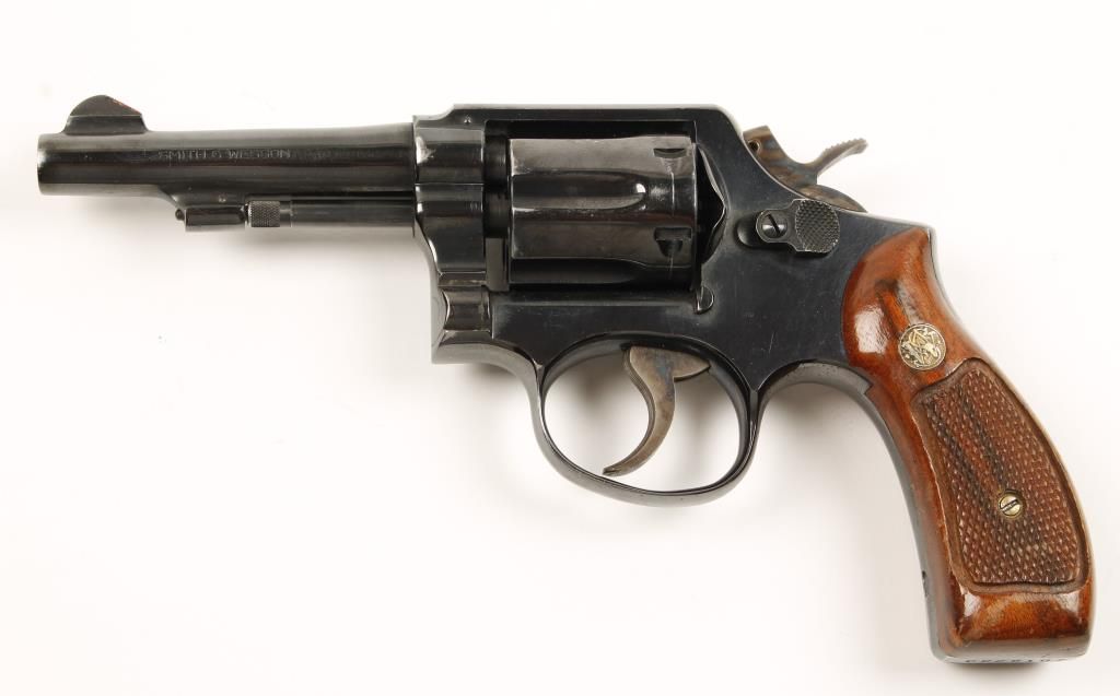 Double action 6 shot revolver with 4" tapered barrel. Blued finish, case colored hammer and trigger, checkered walnut round butt grips and fixed sights. Good bore and action. Condition: Good showing high point wear, cylinder ring and grips show wear. *Modern Firearm*