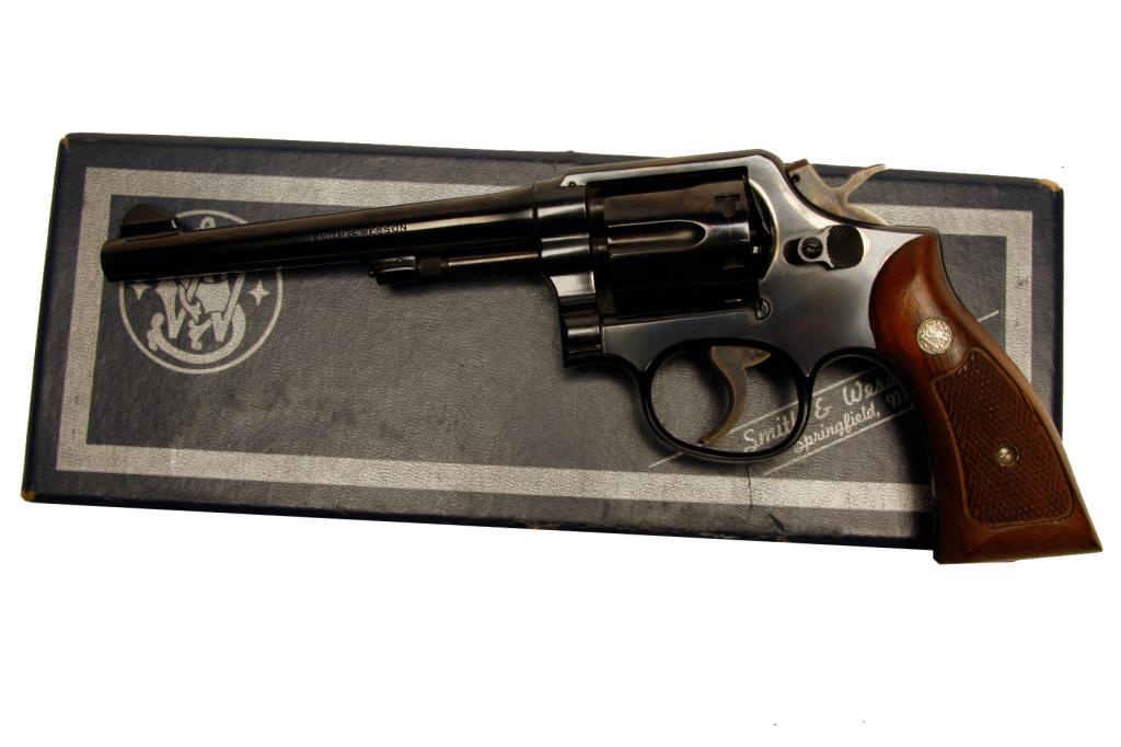 Smith & Wesson Mdl 10-5 Cal .38sp SN:C832924, Double action Military & Police 6 shot revolver. Blued finish, checkered wood SC type Magna grips, 6" barrel with ramped front sight, good bore and action. Condition: Very good to excellent in original box numbered to the gun.
