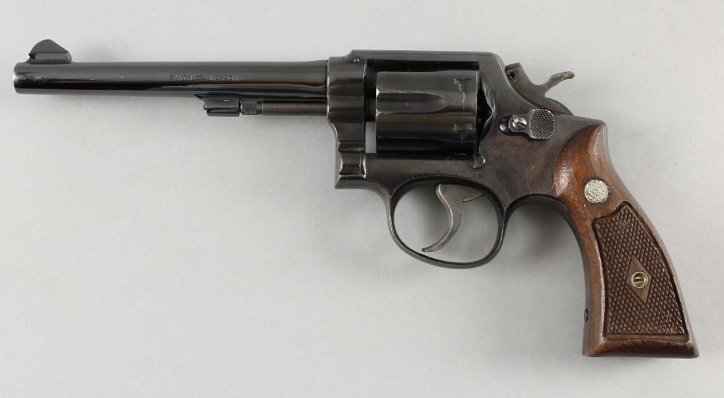 Smith & Wesson Mdl 10-5 Cal .38spl SN:C732576Double action K-frame revolver, polished blue finish, 6" barrel, fixed sights, checkered wood grips, bluing wear at muzzle, cylinder and topstrap, small dings on backstrap, drag line present, excellent bore and action.Condition: Excellent.