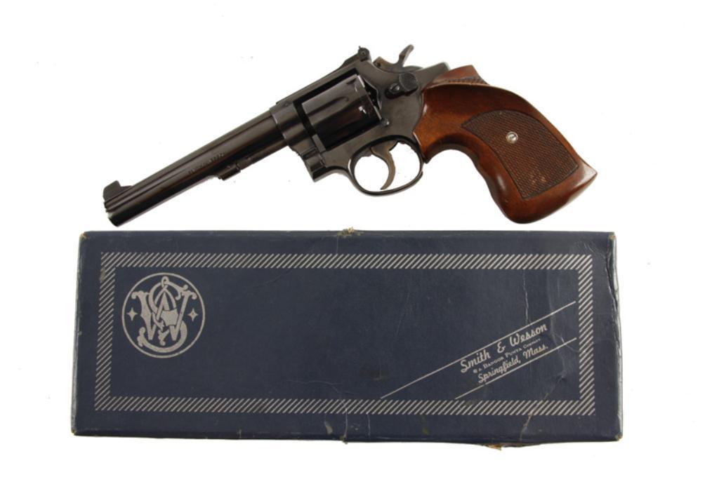 Smith & Wesson Mdl 14-2 .38SP SN:K752961 Double action 6 shot target revolver. Blued finish, wood checkered target grips with finger grooves and thumb rest, 6" barrel with adjustable target sights, semi target hammer, good bore and action.