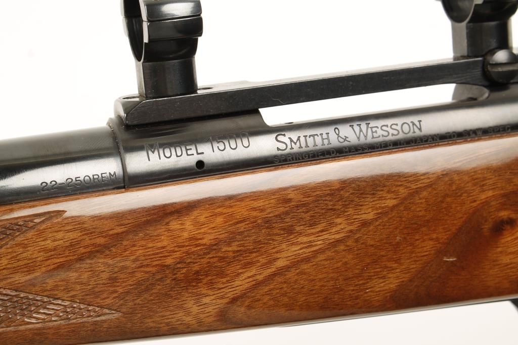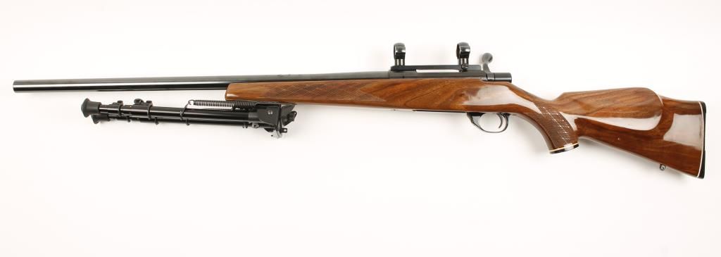 Bolt action deluxe sporting rifle made in Japan in the mid 1980's with 24" heavy barrel. Blued finish, checkered pistol grip wood stock, jeweled bolt, no sights, with scope base and rings, fitted with Harris pivoting 11"-18" bi-pod. Bore is dirty and action is very good. Condition: Good to very good showing use. *Modern Firearm*