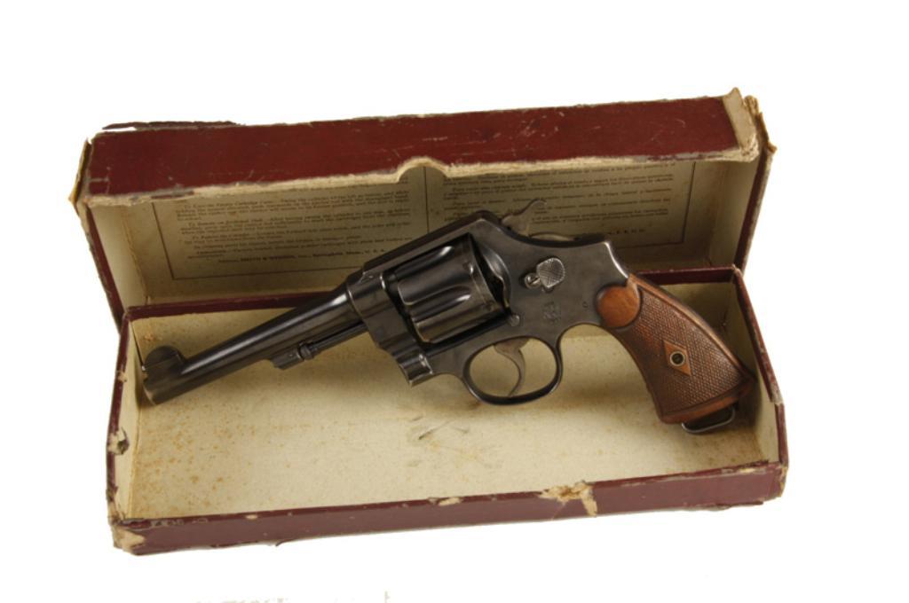 Smith & Wesson Mdl 1917 Commercial Cal .45acp SN:178634, DA revolver in near fine original condition in it's serial numbered correct cardboard box. Our consignors great grandfather who was a military officer, purchased this pistol shortly after WWI and cSN:178634, DA revolver in near fine original condition in it's serial numbered correct cardboard box. Our consignors great grandfather who was a military officer, purchased this pistol shortly after WWI and carried it up until WWII.The revolver shows 95% original blue with slight handling, minor edge and strap loss of finish, but very crisp with bright bore and exceptional grips. A seldom encountered Smith & Wesson with a rare box showing correct and early end label andinstructions.