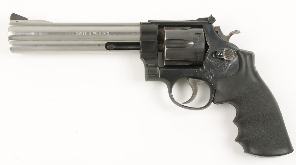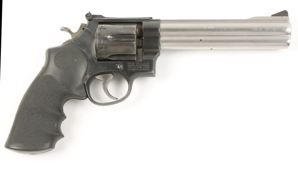 Double action 6 shot revolver that has been made from other parts to make a .38-40. The barrel is a 6-1/2" stainless steel 10mm barrel, the cylinder is for a .38-40. hammer and trigger are case colored, frame is blued, grips are Hogue pebbled black rubber and adjustable rear sight. Good bore and action. Condition: Fair to good showing numerous scratches on left side of frame.