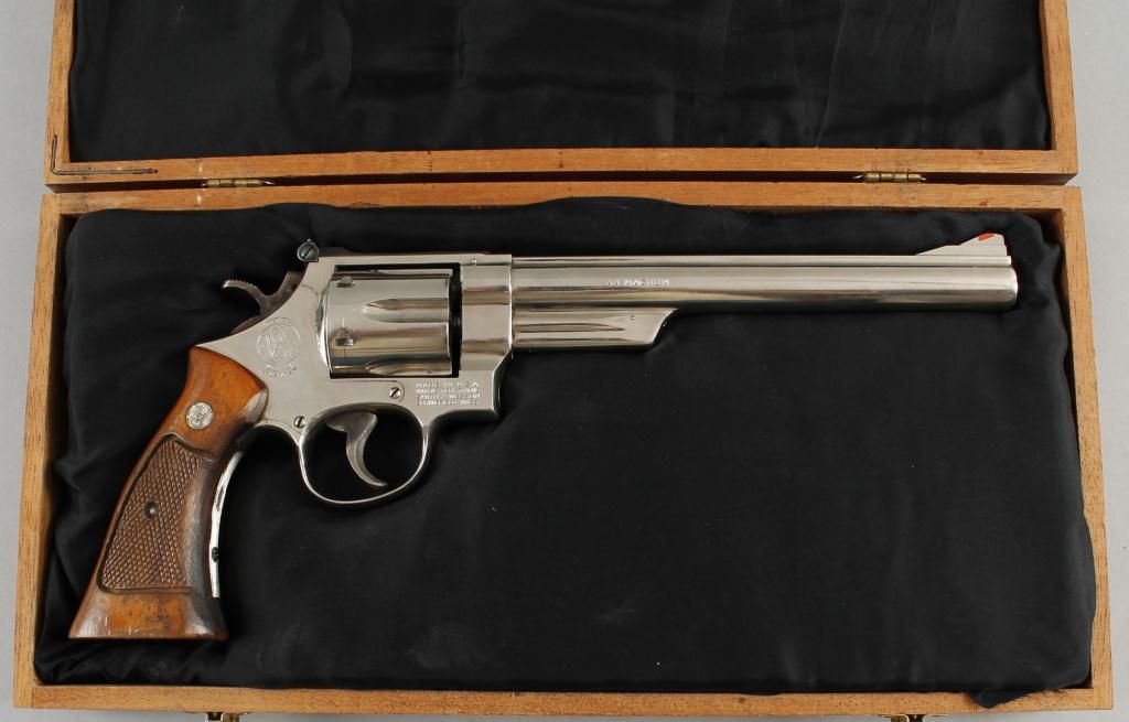 Smith & Wesson Mdl 29-2 Cal .44mag SN:N751673Double action revolver with 8 3/8" barrel, nickel finish with checkered wood grips with medallion, adjustable rear sight with red insert front sight, good bore and action. Includes padded wood display box.Condition: Finish is good and grips are well worn.