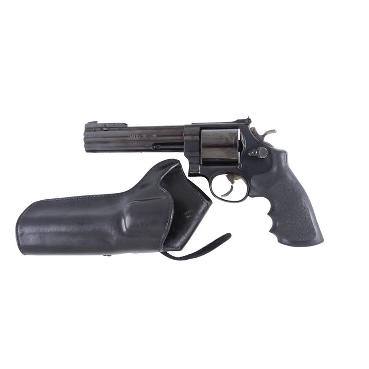 Smith & Wesson Mdl 29-3 Cal .44mag SN:AYE2584 Large "N" frame revolver in .44 Magnum chambering with a 4 position front sight designed for Silhouette shooting. Blued finish, black pebbled Hogue grips, 6" full lug barrel, unfluted 6 shot cylinder, targLarge "N" frame revolver in .44 Magnum chambering with a 4 position front sight designed for Silhouette shooting. Blued finish, black pebbled Hogue grips, 6" full lug barrel, unfluted 6 shot cylinder, targetsights, target hammer and trigger, good bore and action. Included with black leather Galco holster. Condition: Excellent with little sign of use.