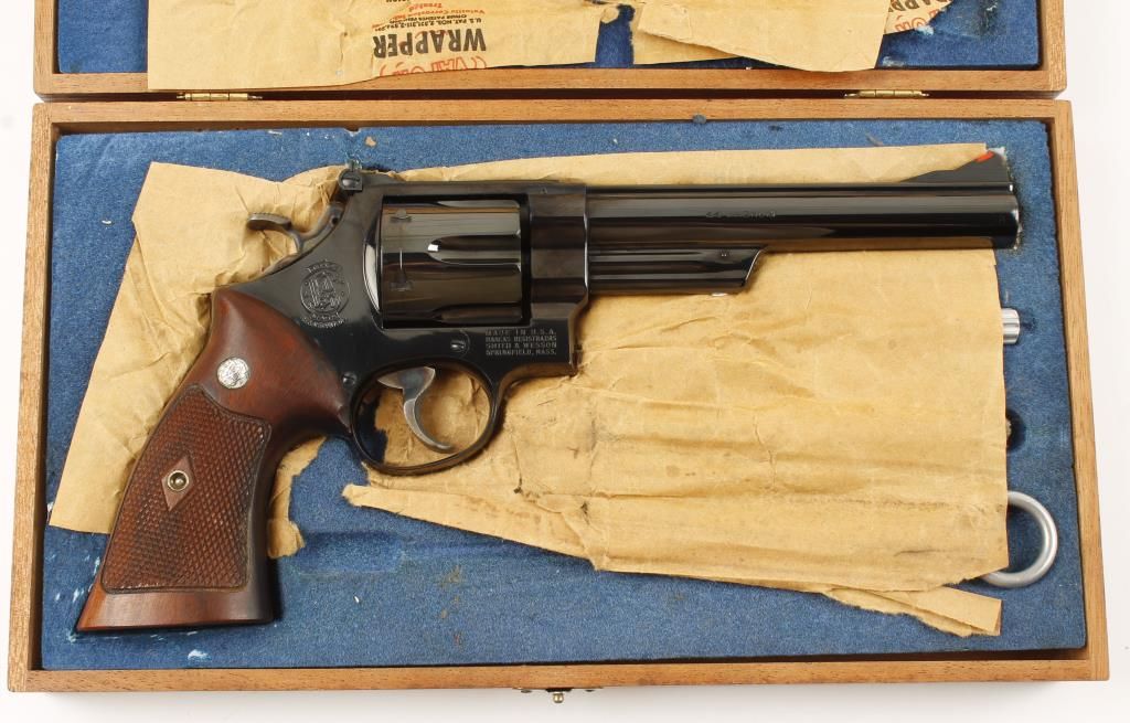 Double action revolver made about 1961 with 6-1/2" barrel. Blued finish, checkered diamond walnut grips, case colored hammer and trigger, red insert front sight and adjustable rear sight. Excellent bore and action. Includes wood molded box. Condition: Very good to excellent showing cylinder ring. *Curio & Relic Firearm*