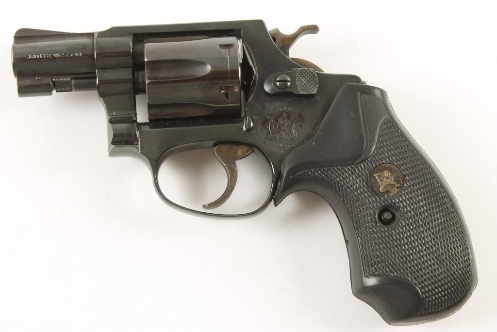 Double action 6 shot revolver with 2" barrel. Blued finish, checkered black rubber Pachmayr grips, case colored hammer and trigger and fixed sights. Very good bore and action. Condition: Very good showing cylinder ring and light use. *Modern Firearm*