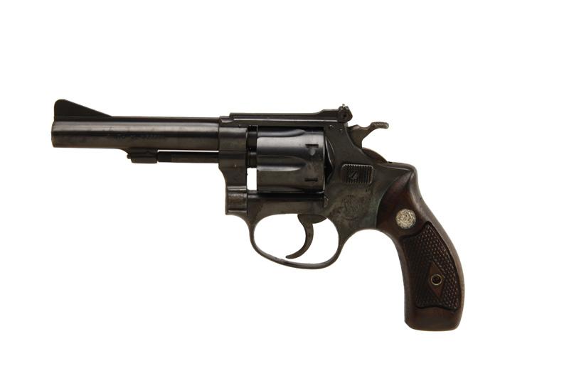 Smith & Wesson Mdl 34 Cal .22LR SN:12354 Early double action 6 shot Kit Gun. Blued finish, checkered wood Magna style grips with diamond centers, flat latch cylinder release, 4" barrel with adjustable sights, good bore and action. Matching numbers.