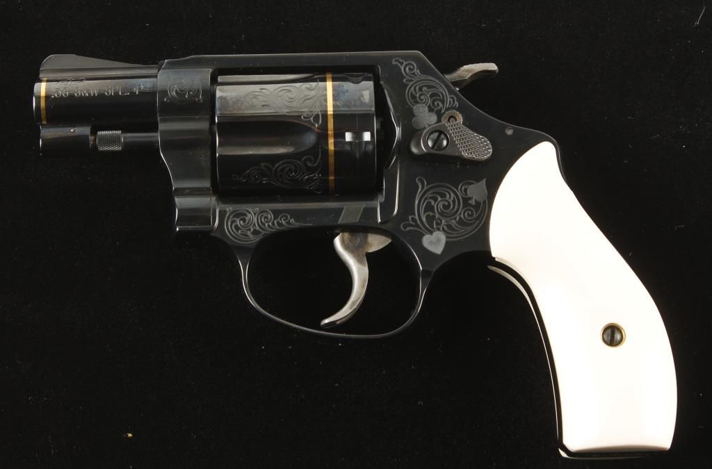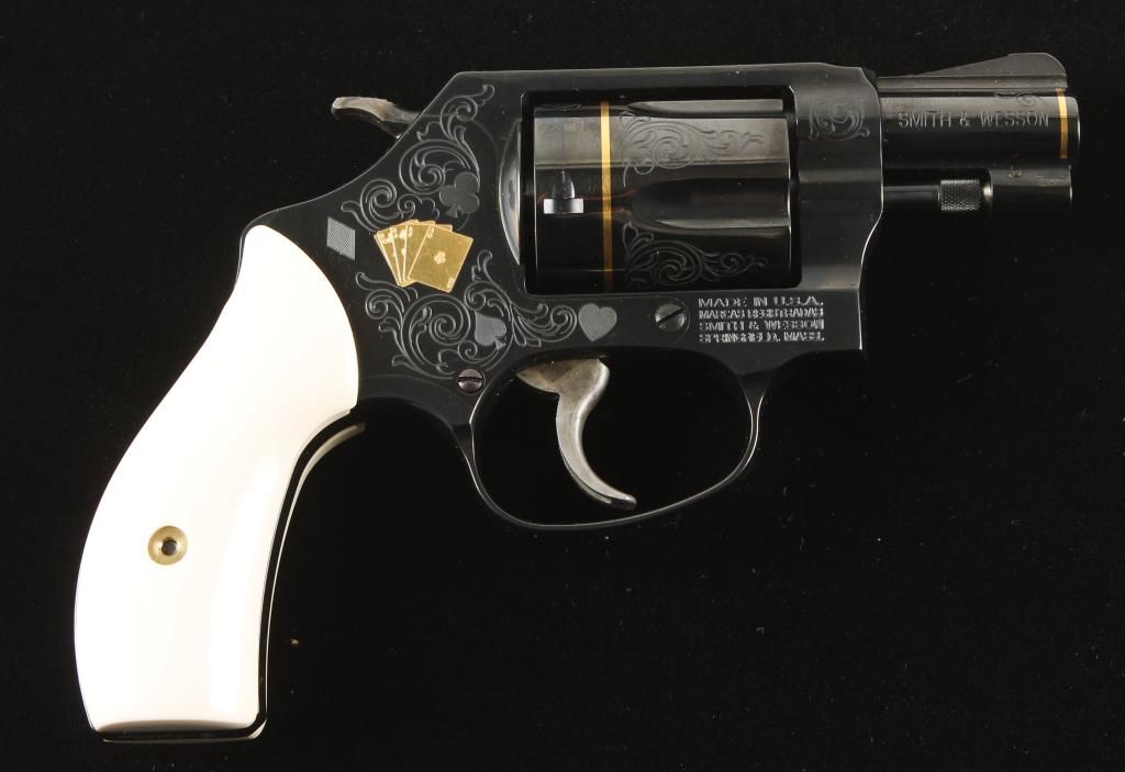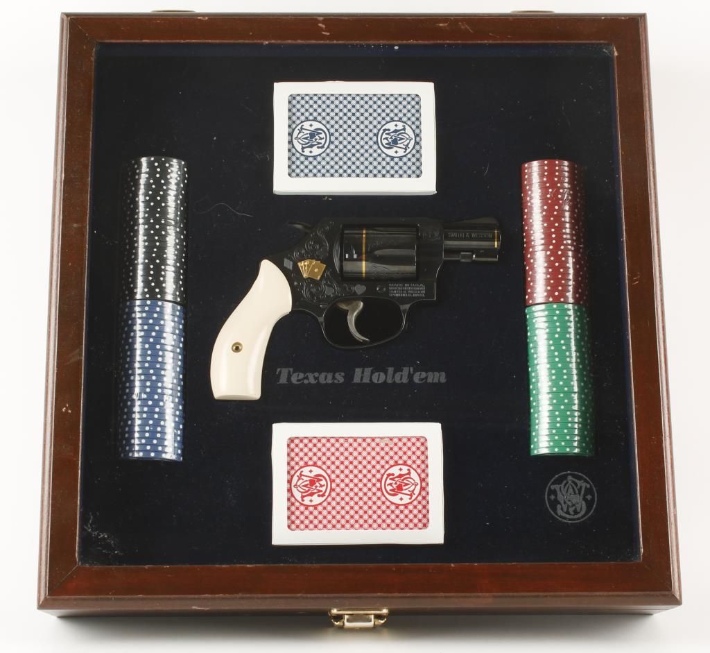 Double action 5 shot Texas Hold'em revolver with 1-7/8" barrel. Blued finish scroll engraved with spades, hearts, clubs and diamonds, case colored hammer and trigger, faux ivory grips and fixed sights. Gold inlaid cards on right side of frame, cylinder and muzzle show gold ring. Includes glass top display box with black, blue, red and green poker chips and 2 decks of playing cards all with the S&W monogram. Excellent bore and action. Condition: Very good to excellent showing very light cylinder ring. Poker chips and cards are unopened in original packaging. *Modern Firearm*