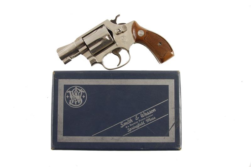 Smith & Wesson Mdl 36 .38SP SN:J849092 Double action 5 shot pocket revolver called the "Chief's Special". Nickel finish, checkered Magna style grips with silver medallions, 2" barrel with fixed sights, good bore and action.