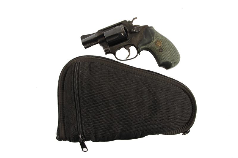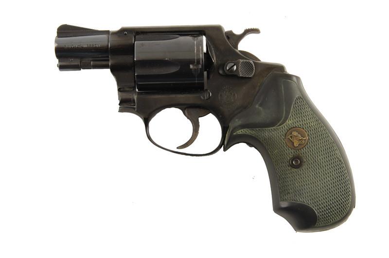 Smith & Wesson Mdl 36 Cal .38Spec SN:666855 Nice double action 6 shot revolver in .38 spec caliber for concealed carry. Blued finish, black checkered Pachmayr grips with original wood grips included, 2" barrel with fixed sights, good bore and action.