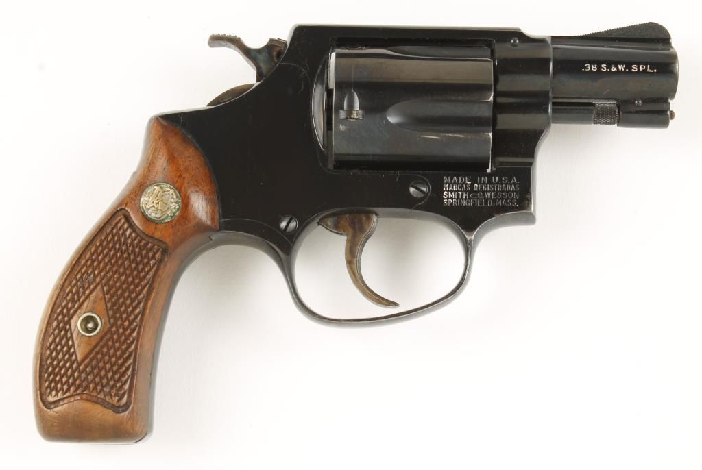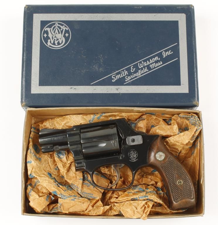 Early double action 5-shot "Chiefs Special" revolver with 2" barrel. Made about 1965. Blued finish, checkered diamond walnut round butt grips with medallions, case colored hammer and trigger, flat latch, and fixed sights. Excellent bore and action. Includes original numbered box. Condition: Very good showing light wear and faint cylinder ring. *MODERN FIREARM*