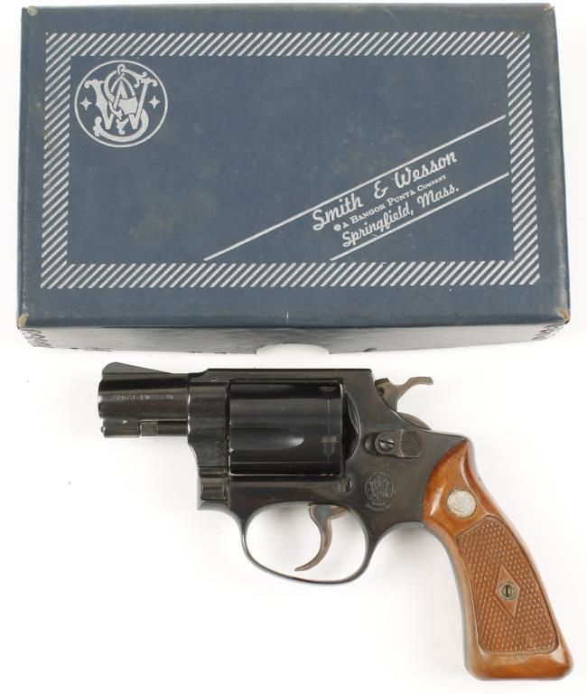 Double action 5 shot "Chiefs Special" revolver with 2" barrel. Blued finish, case colored hammer and trigger, checkered diamond wood grips and fixed sights. Good bore and action. Includes original box. Condition: Very good showing light pinpricking on left side of frame near cylinder release.