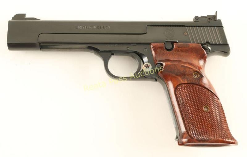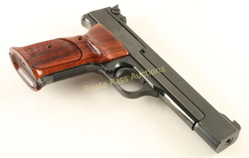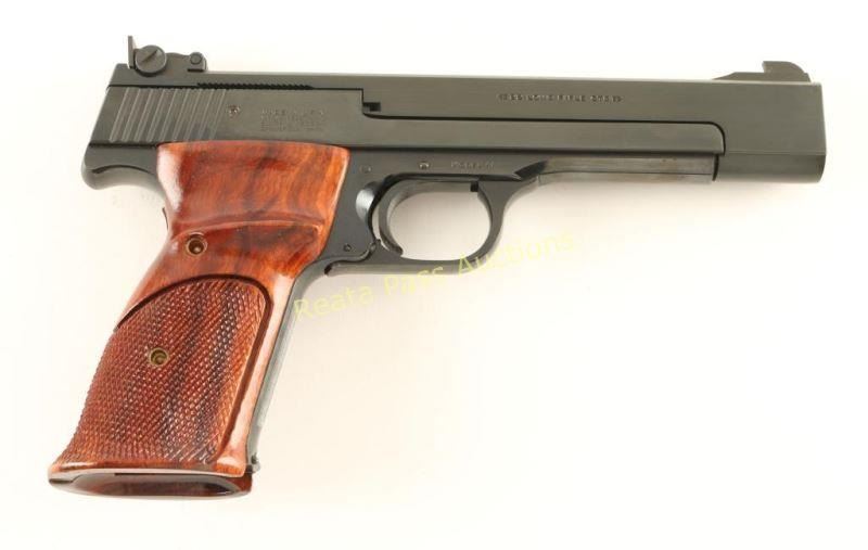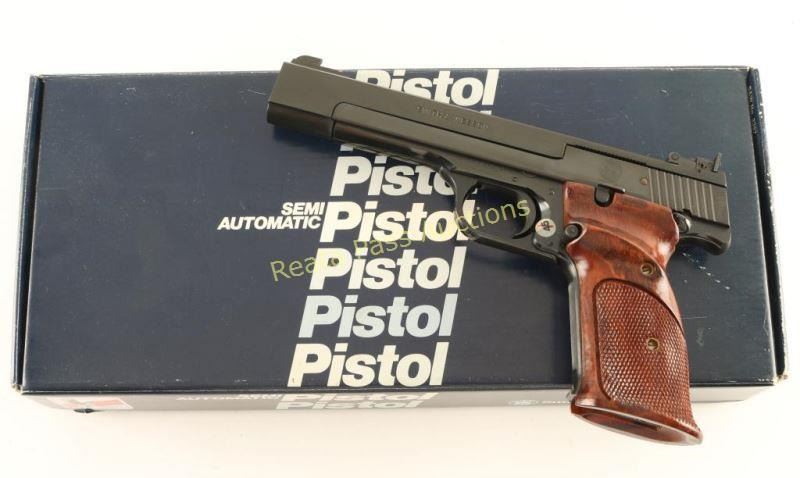 Single action semi-automatic match target pistol chambered in .22 Long Rifle, circa 1984-1994. Features a blued finish, 5.5" barrel, ramped patridge front sight, adjustable rear target sight, serrated target trigger, push button magazine release, 10 round factory magazine, thumb safety, serrated front strap and two-piece checkered walnut target grips. Includes the original factory cardboard box with documents, cleaning tools, wax paper and flag. Pistol exhibits no visible wear. Action is smooth, bore is pristine and wood grips are extra fine. Believed to be un-fired. Condition is near new in box. ***Modern Firearm***