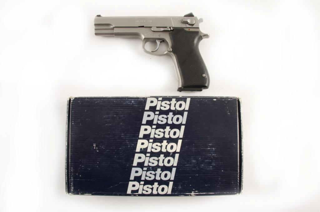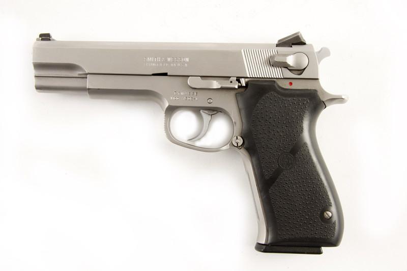 Condition: Excellent with littleDouble action semi-auto pistol. Stainless steel construction, black pebbled wrap around S&W grips, 5" barrel with adjustable 3 dot low drag Novak sights, good bore and action. Condition: Excellent with little sign of use. InS&W box not for this gun. 1 magazine.