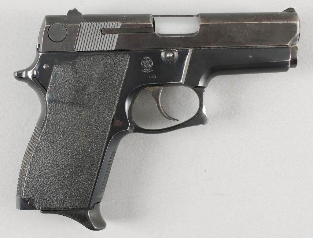 Smith & Wesson Mdl 469 Cal 9mm SN:A862547Double action semi automatic pistol, black alloy frame and blued steel slide, black plastic grips, 3.5" barrel, decocker safety, magazine safety, bobbed hammer, very good bore and action, has wear to the finish onthe corners of the frame and the muzzle of the slide. Includes 2 magazines. Condition: Good