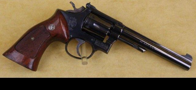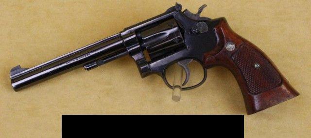 Smith & Wesson Mdl 48 Cal .22MRF SN:K384973 Four screw, double action revolver, 6" barrel, blue finish, checkered combat medallion wood grips. This gun is in overall excellent condition showing approx 97% original blue finish, excellent bore, actionFour screw, double action revolver, 6" barrel, blue finish, checkered combat medallion wood grips. This gun is in overall excellent condition showing approx 97% original blue finish, excellent bore, action and markings; wood grips are verygood with loss to the finish at the bases and a sliver loss at the front toe of the left grip.