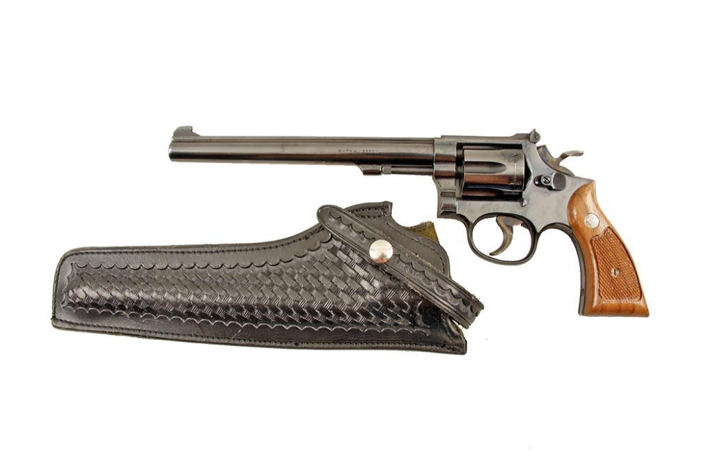 Smith & Wesson Mdl 48 Cal .22Mag SN:K419618 Double action 6 shot revolver chambered for caliber .22MRF. Blued finish, checkered square butt Magna PC grips which are not correct for this gun, 8 3/8" barrel, adjustable sights, pinned and recessed, targDouble action 6 shot revolver chambered for caliber .22MRF. Blued finish, checkered square butt Magna PC grips which are not correct for this gun, 8 3/8" barrel, adjustable sights, pinned and recessed, target hammer and trigger, good boreand action. Condition: Excellent with little sign of use. In nice black leather Safariland holster. No box.