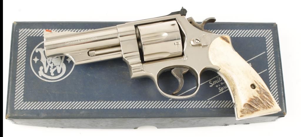 Double action 6 shot revolver with 4" barrel. Nickel finish, case colored hammer and trigger, stag grips, red insert front sight and adjustable rear sight. Very good bore and action. Include blue S&W cardboard box with no markings and 2 speed loaders. Condition: Very good showing cylinder ring.