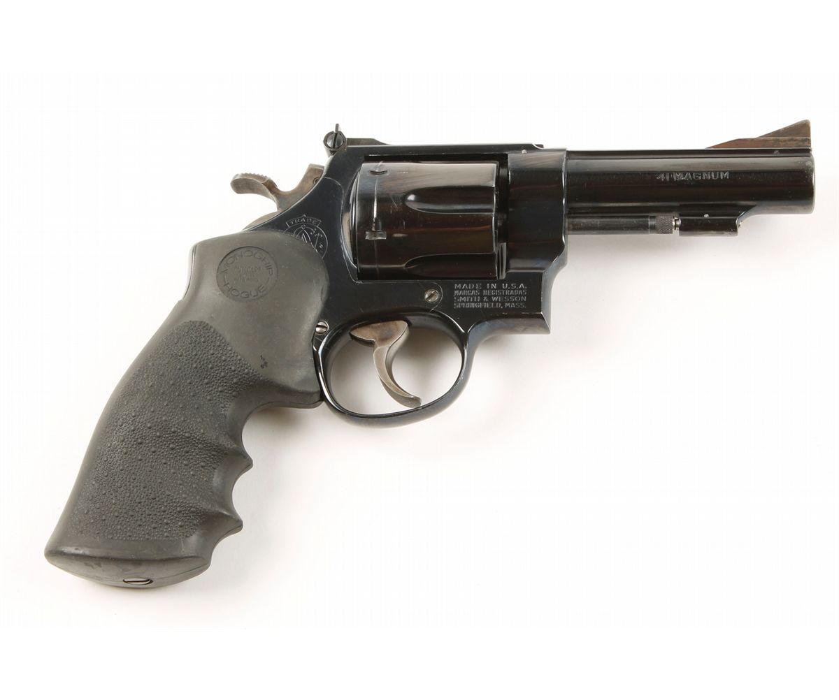 Double action six shot revolver with 4" barrel. Blued finish, case colored hammer and trigger, pebbled black rubber Hogue grips, adjustable whit outline rear sight and front sight has solid steel insert where red insert once was. Very good bore and action.
