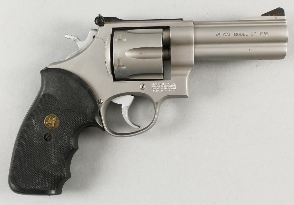 Smith & Wesson Mdl 625-3 Cal .45acp SN:BEN0363Double action N-frame revolver, "45 CAL MODEL OF 1989", matte stainless finish with blued sights (adjustable rear), Pachmayr Gripper grip on round butt frame, 4" barrel with serrated rib and full underlug, drag linepresent and some shiny rub marks in the finish, very good bore and action. Condition: Very good.