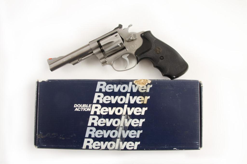 Smith & Wesson Mdl 63 Cal .22LR SN:AWZ9010 Nice double action 6 shot revolver in .22LR caliber call a "Kit Gun". Stainless steel construction, black checkered Pachmayr grips with original wood grips included, 4" barrel with adjustable sights, good bore aNice double action 6 shot revolver in .22LR caliber call a "Kit Gun". Stainless steel construction, black checkered Pachmayr grips with original wood grips included, 4" barrel with adjustable sights, good bore and action.Condition: Excellent but has been used. Included in original box numbered to the gun and cleaning kit.