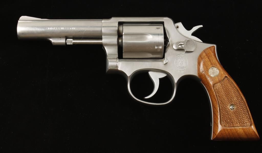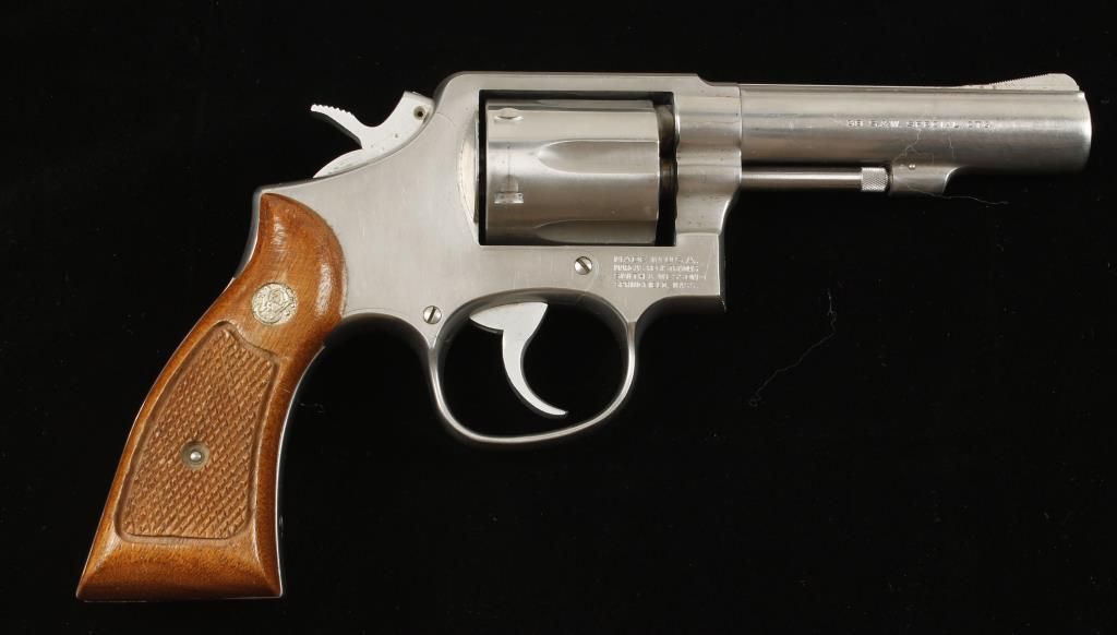 Double action 6 shot stainless steel version of the popular Model 10 revolver with 4" barrel. Checkered walnut with medallion, non-shrouded ejector rod, and fixed sights. Good bore and action. Condition: Good overall showing light scratching and cylinder ring. *MODERN FIREARM*