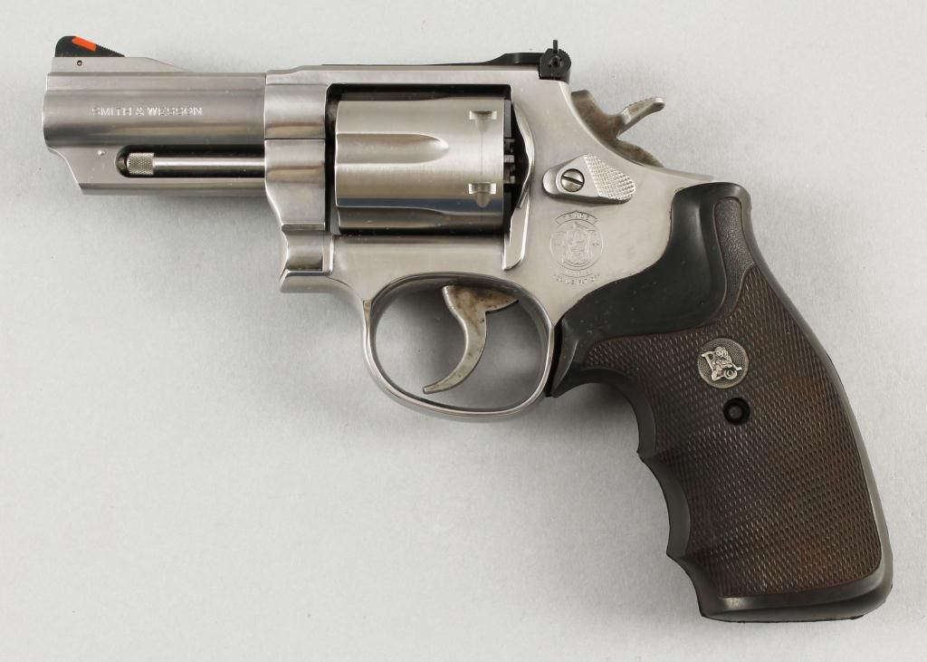 Smith & Wesson Mdl 66-5 Cal .357 SN:CDC5903Double action K-frame revolver, stainless steel construction with polished finish and blued steel adjustable sights on matte finish top strap, drag line is present, round butt frame with Pachmayr Gripper grip, 3" fullunderlug barrel, excellent bore and action. Condition: Excellent.