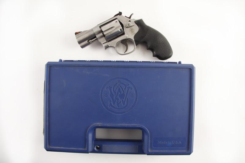 Smith & Wesson Mdl 686-6 Cal .357 Mag SN:CHE5747, Double action 6 shot short barreled revolver. Stainless steel construction, black pebbled grips, 2 1/2" barrel with red ramp adjustable sights, frame key lock above cylinder release latch, good bore and aSN:CHE5747, Double action 6 shot short barreled revolver. Stainless steel construction, black pebbled grips, 2 1/2" barrel with red ramp adjustable sights, frame key lock above cylinder release latch, good bore and action.Condition: Excellent with some use. Included in original blue carry case with key for frame lock.