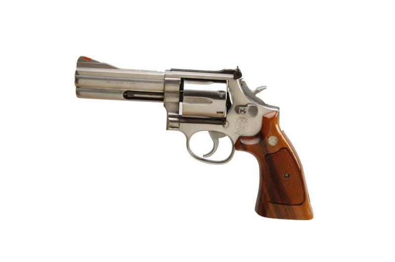 Smith & Wesson Mdl 686 Cal .357 Mag SN:AEJ0980, Double action 6 shot revolver. Stainless steel construction, checkered target grips, 4" barrel with adjustable red ramp/white outline sights, good bore and action. Needs cleaned.