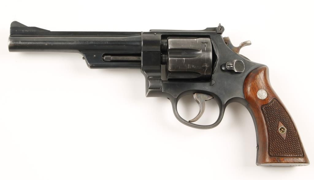 SN:S129128; Pre model 28 double action revolver with 6" barrel. Matte blue finish, case colored hammer and trigger, checkered walnut diamond grips, shrouded cylinder rod and adjustable rear sight. Very good bore and action. Condition: Good showing high point and holster wear and grips are good. *Curio & Relic Firearm*