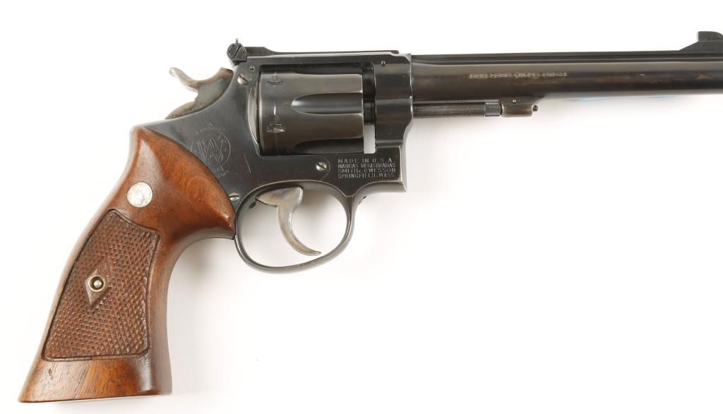 Double action, 6-shot 5-screw rimfire revolver with 6" round solid rib barrel, made about 1956. Blued finish, checkered diamond walnut grips with medallion, case colored hammer and trigger, grooved back strap and top strap, partridge front sight, and adjustable rear sight. Very good bore and action. Condition: Good to Very Good overall, showing thinning bluing, light muzzle wear, and cylinder ring. *CURIO & RELIC FIREARM*