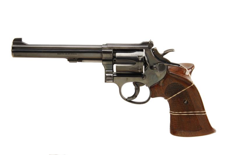 Smith & Wesson Mdl K38 Masterpiece Cal .38sp SN:304412, Double action 6 shot target revolver with 4 screw frame. Blued finish, checkered thumb rest custom wood target stocks, 6" barrel with adjustable target sights, good bore and action.