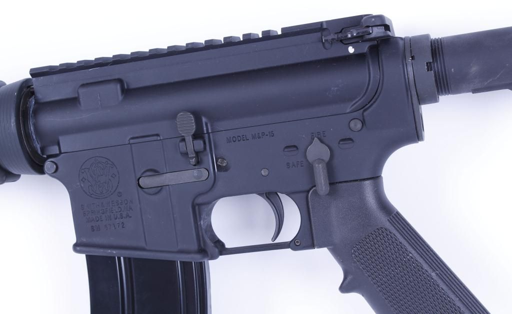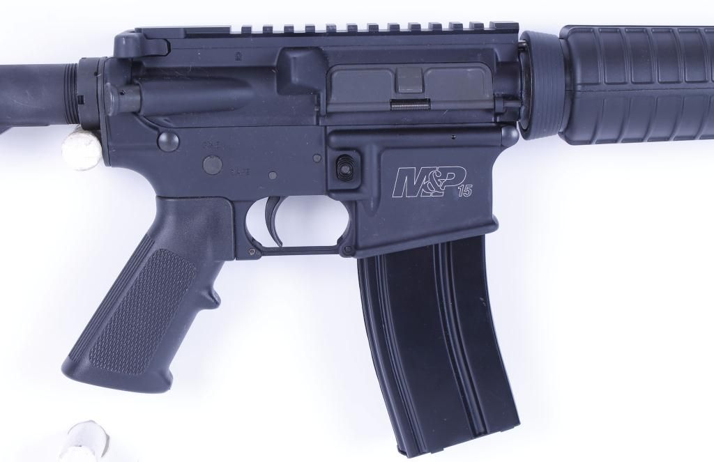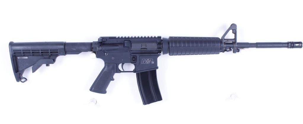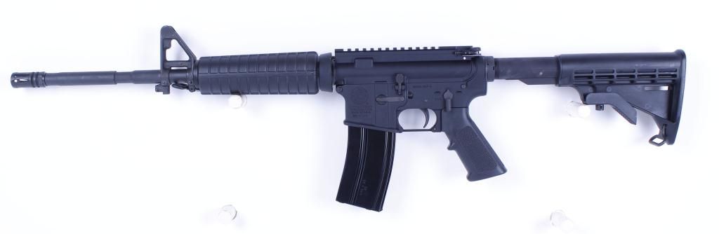 Semi auto AR rifle with 18" barrel, black finish, black composite collapsible stock, pistol grip and hand guard, A2 style front sight and picatinny rail. Excellent bore and action. Includes original black hard case, manual and 1 magazine. Condition: Very good showing very little use.
